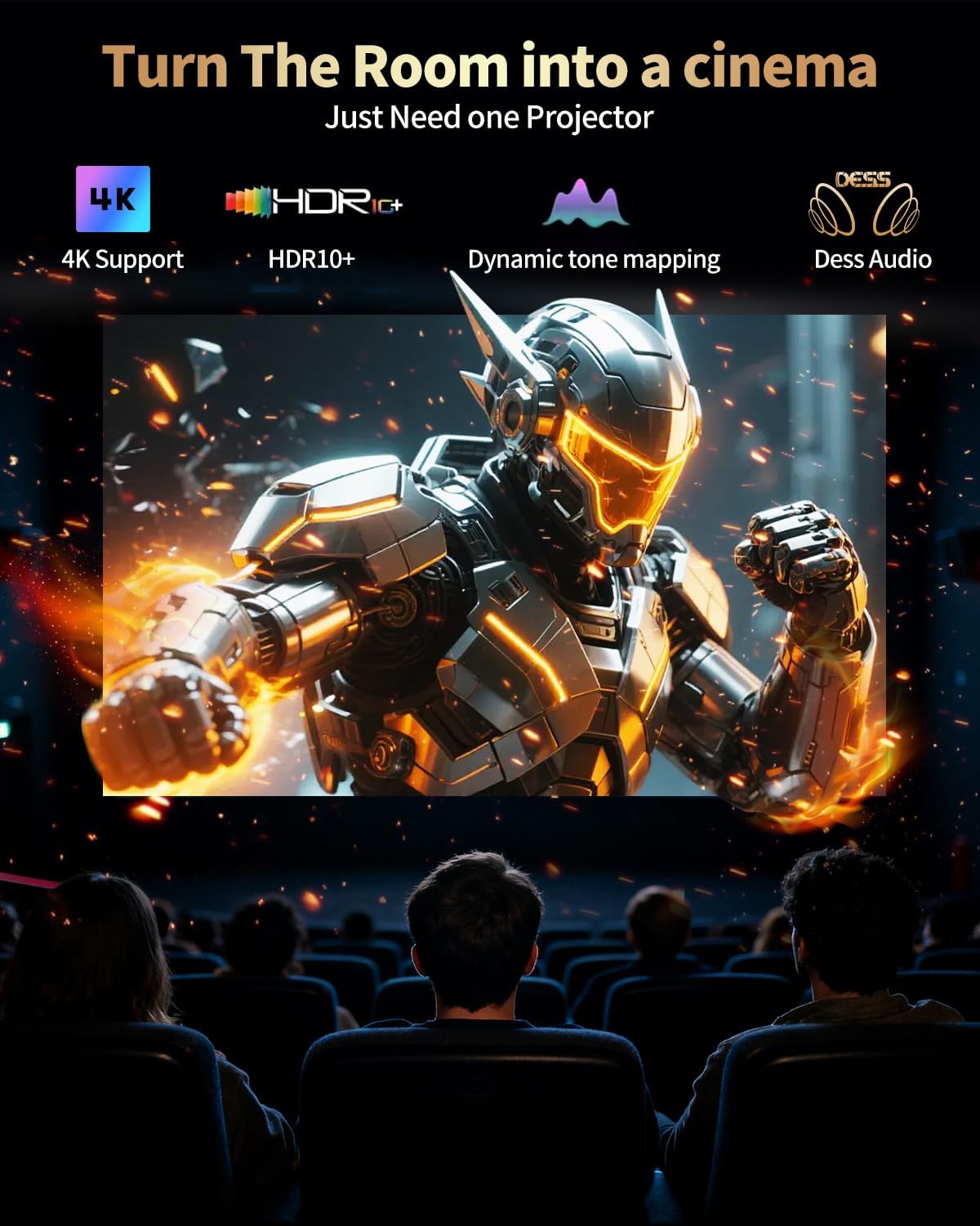 【Dess C5 Enterprise+2025 New Release】 The Newest Home Theater projector has upgraded its audio function and is equipped with two 30W ultra large speakers, allowing for a cinema experience without the need for an external speaker. The latest technologies combined optical, visual algorithms and electric stand together to enable this Movie projector with auto sensing ability to recognize user’s movement and adjust image clarity,shape and position automatically on the wall.The bluetooth projector use The latest chip to improve image quality and stability while reducing power consumption.