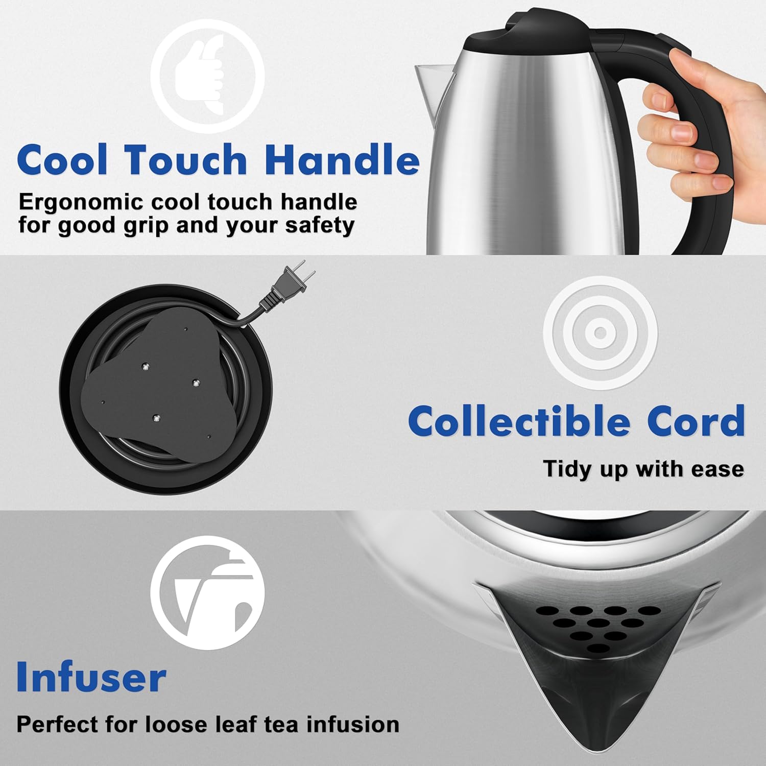 Safety Design – Equipped with auto shut-off and boil-dry protection for worry-free operation. This water kettle can be lifted off the base for use without the hazard of cords and the handle comes with a soft non-slip material and a heat resistant design.