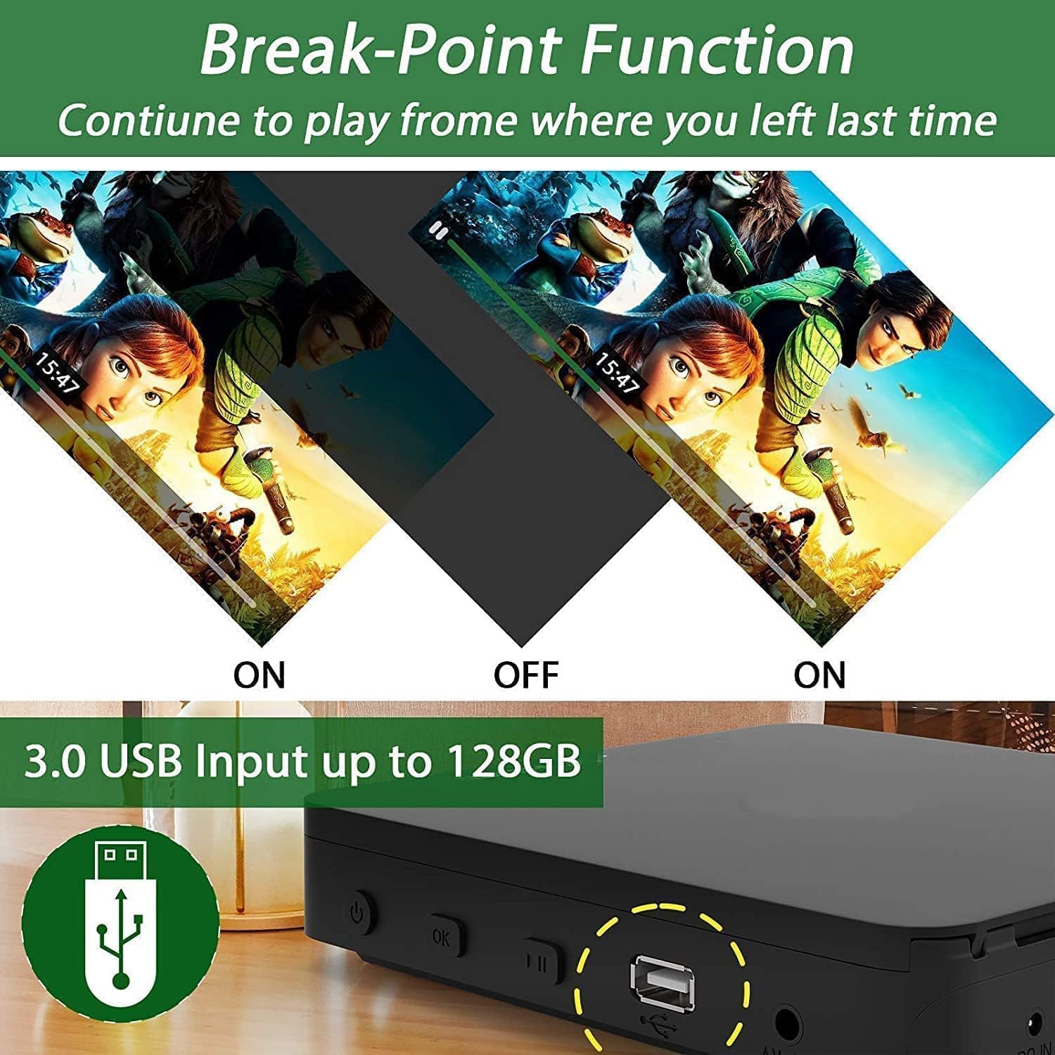 Extensive Compatibility: Supports Max 128G USB Flash Drive and all DVDs and Region A 1 Blu-Rays with built-in PAL/NTSC capability.