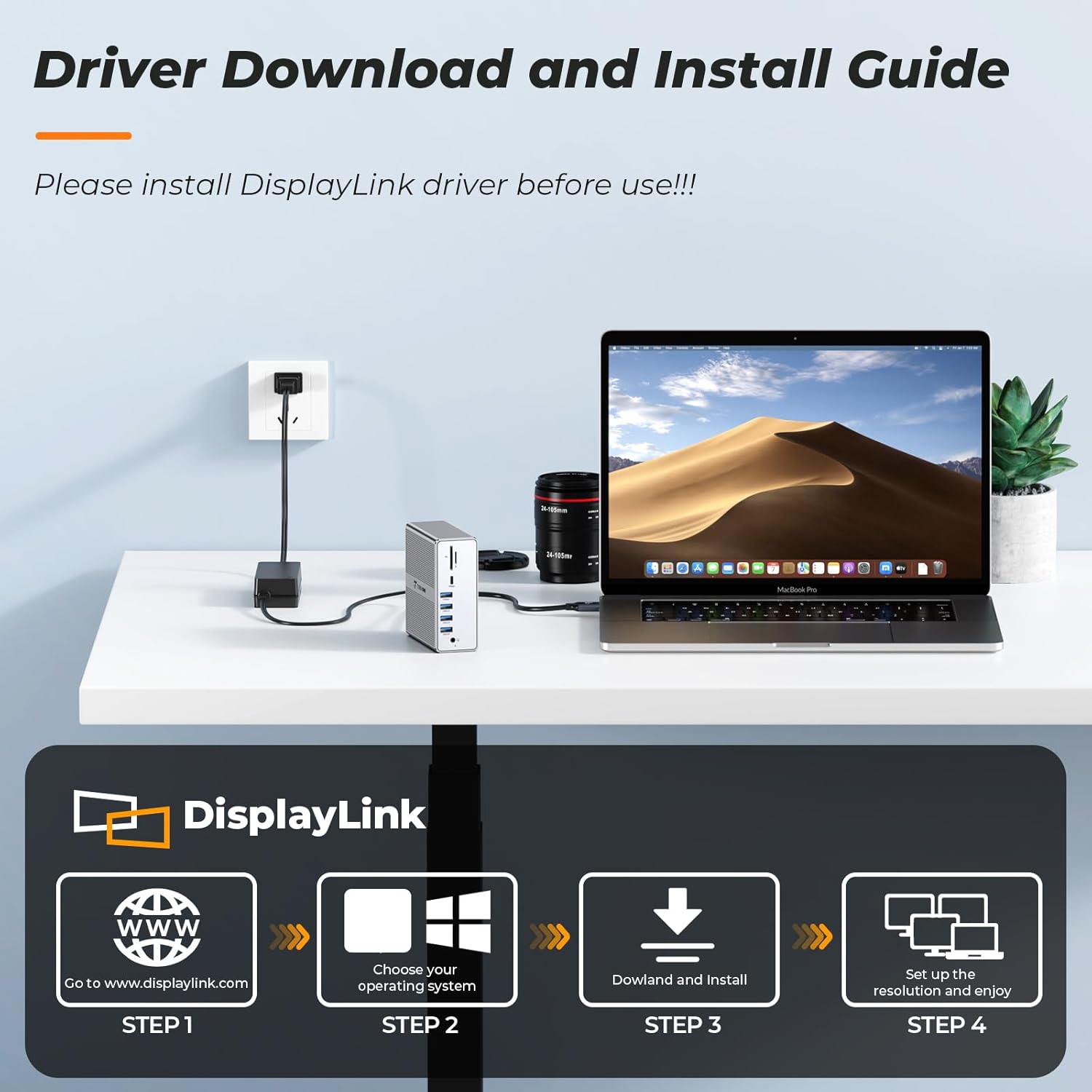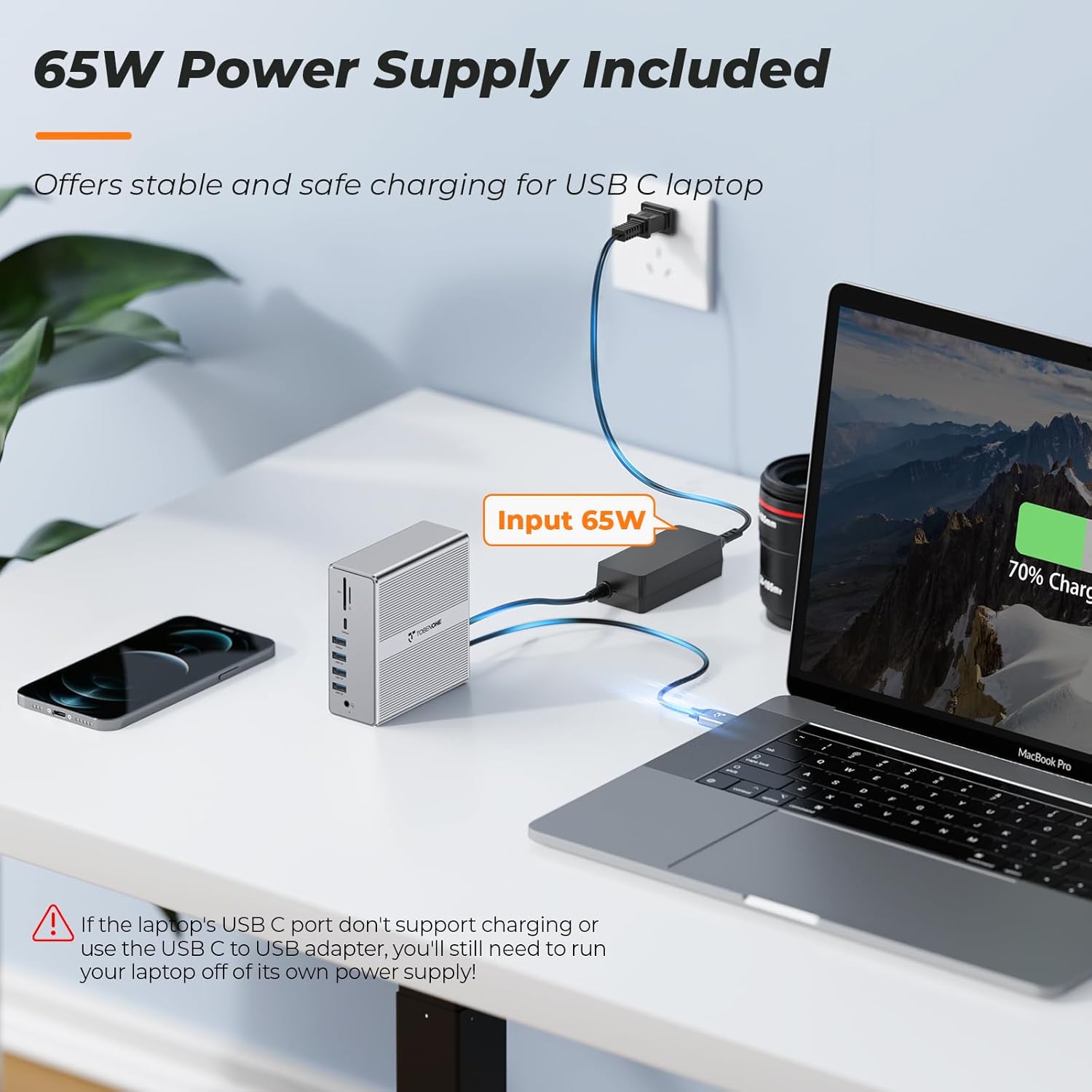 65W Power Supply Included – Unlike most docks, this TobenONE universal laptop docking station comes with a power adapter so you can keep the original power adapter in your travel bag. For Apple or Windows laptop, the DisplayLink docking station will stably and safely charge the laptop immediately upon connection, which simplifies cable management