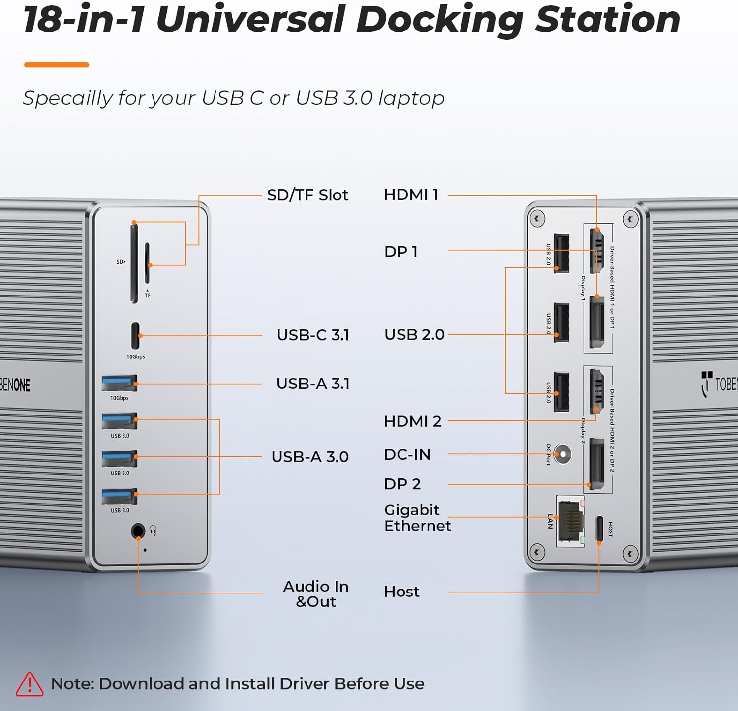 Powerful Expand Your Workstation: TobenONE 18-in-1 Multiport Docking Station allow you to connect all external devices through a single Hybrid 2-in-1 USB Cable to computer. Up to 18 port!!! Making it easier to do more work in less time. This dell docking station with dual HDMI or DP to extend Dual 4K@60Hz display, 7 USB A and 1 USB C for external USB devices. 1 host to connect USB-C or USB 3.0 laptop, 1 DC-IN port to connect the power supply, SD/TF, Gigabit Ethernet, 3.5mm Audio in&out