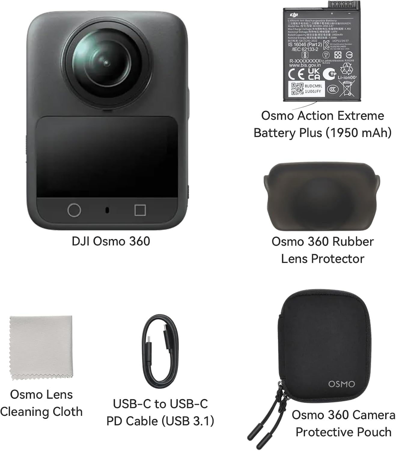 Standard Package Includes:1 × Osmo 360 Camera, 1 × Osmo Action Endurance Battery (1950 mAh), 1 × Osmo 360 Carry Pouch, 1 × Osmo Lens Cloth, 1 × USB-C to USB-C PD Fast Charging Cable (USB 3.1), 1 × Osmo 360 Lens Protective Cover. Provides all the essentials needed to embark on a 360-degree panoramic camera adventure, making it the ideal choice for everyday action vlog camera users and creators.