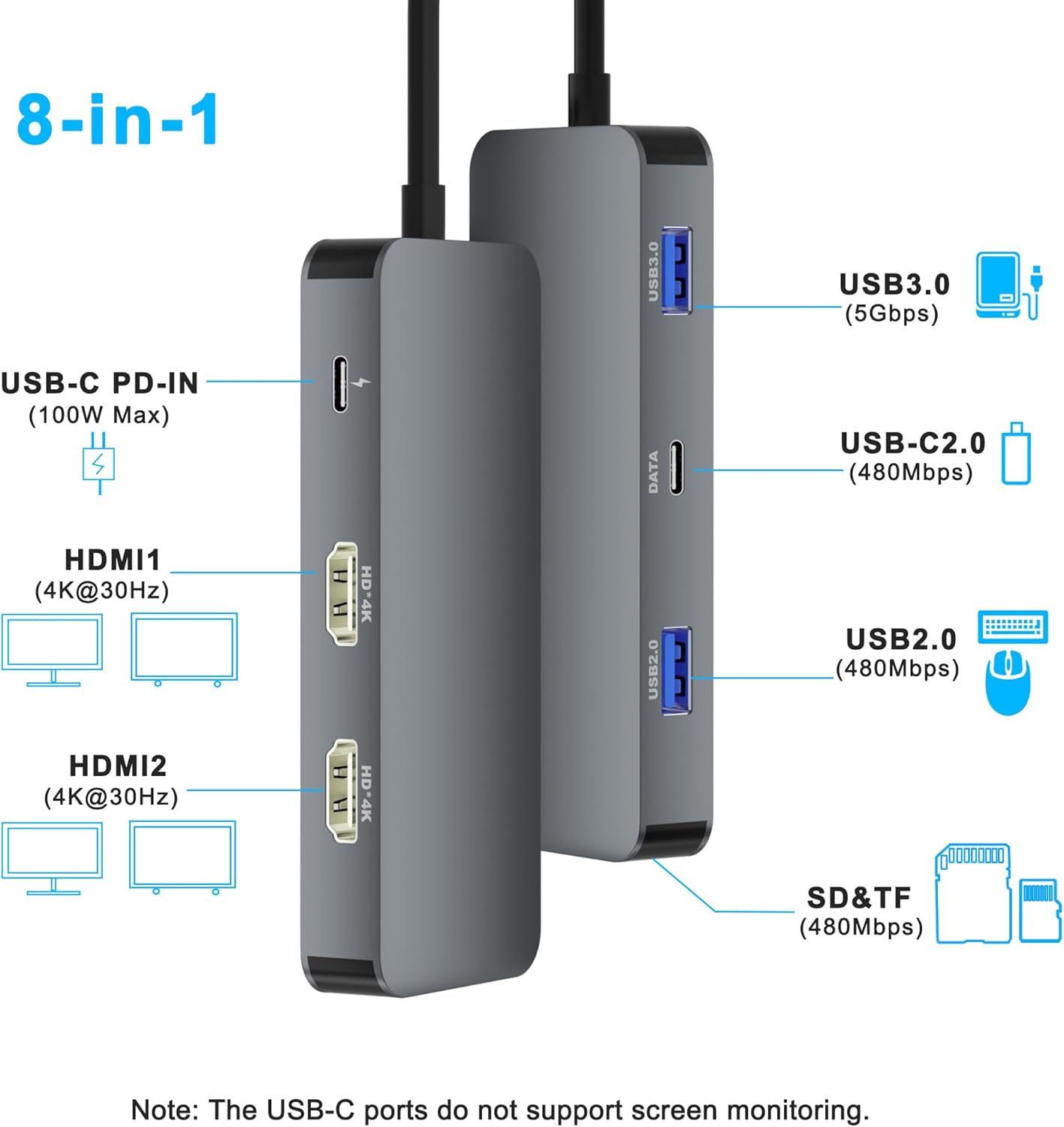 【8 IN 1 Laptop Docking Station】: Laptop Docking Station converts your USB C Windows Laptops one Type C/Thunderbolt 3 port into 8 Ports: 2 x 4K@30Hz HDMI, 1 x USB 3.0, 1 x USB 2.0, 1 x USB C data, SD/TF card reader, 100W PD. Please note: not for all usb-c port laptops, Make sure your laptop or PC support video output (Thunderbolt 3/ Thunderbolt 4 ) or DP Alt Mode, which decides the hdmi port work or not.