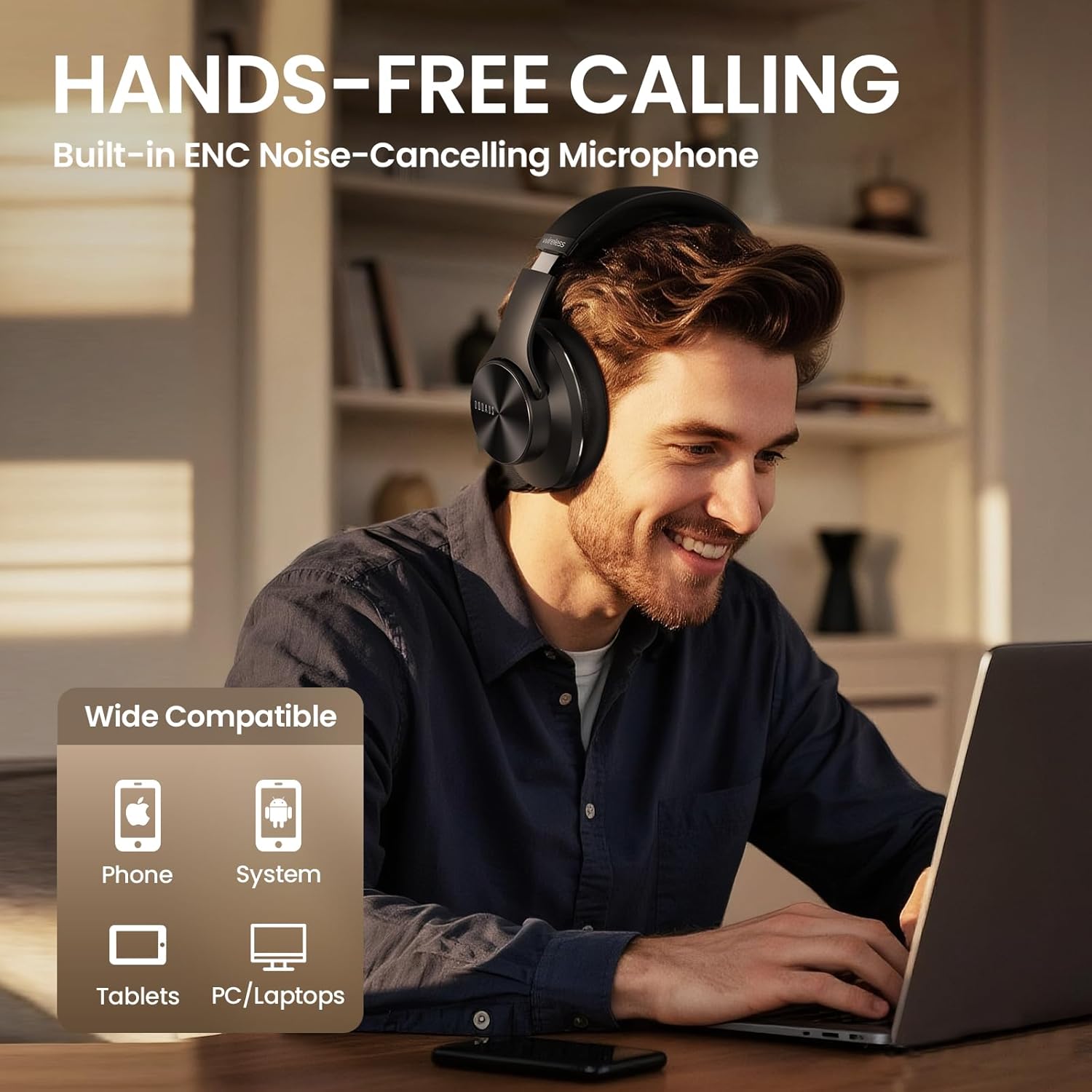 Bluetooth 5.3 & Crystal Clear Calls: Experience superior audio and connectivity. Dual 40mm drivers deliver powerful sound, while advanced Bluetooth 5.3 ensures stable transmission, lower latency, and enhanced audio quality. The built-in ENC microphone on these over ear Bluetooth Headphones wireless drastically reduces ambient noise for crystal-clear hands-free calls.