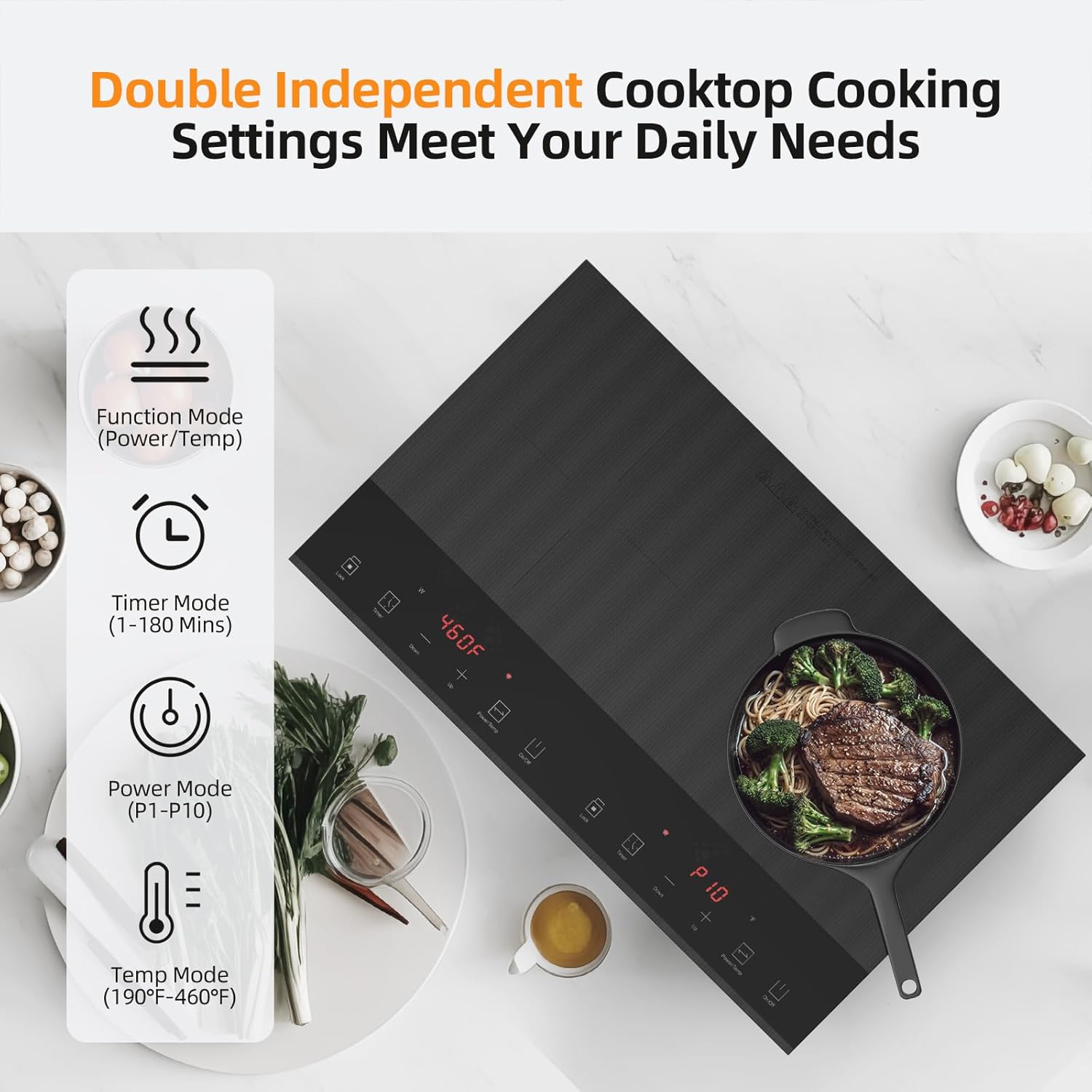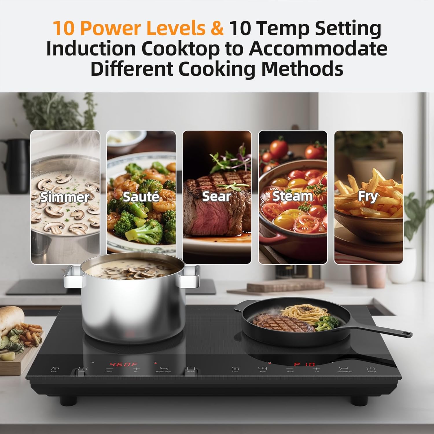 🍟【10 Power Levels &10 Temperature Range Heat Control]】The dual zone induction cooker provides a total of 10 adjustable power levels (P1-P10).The default setting is P5,touch the “Power/Temp” panel twice to change the temperature mode, the temperature range is 190 ℉-460℉.The expanded range of temperature settings allows you to precisely fine-tune the temperature according to your cooking needs. Whether you need to cook slowly over low heat or sizzle over high heat, our cooktop provide the perfect amount of heat for your culinary creations.