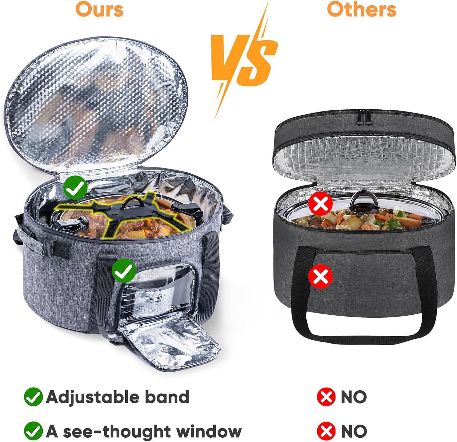Advanced Features & Well Made – Advanced features include a see-thought window which allows you to see the temperature display without taking the slow cooker out, and an adjustable band to secure the slow cooker for travel. The travel crck-pot bag is made of sturdy material with 5mm heavy padding and strong support, the quality SBS zippers have worked smoothly for years.