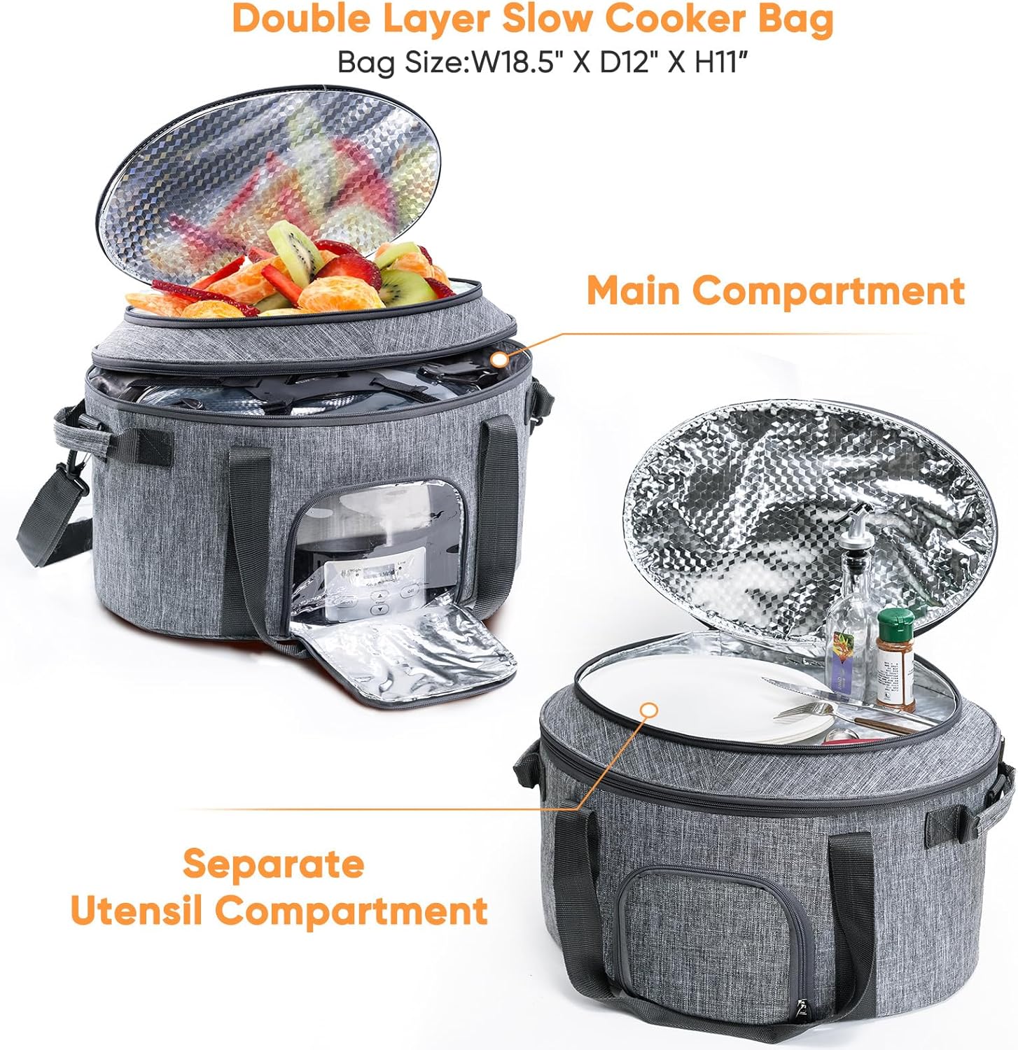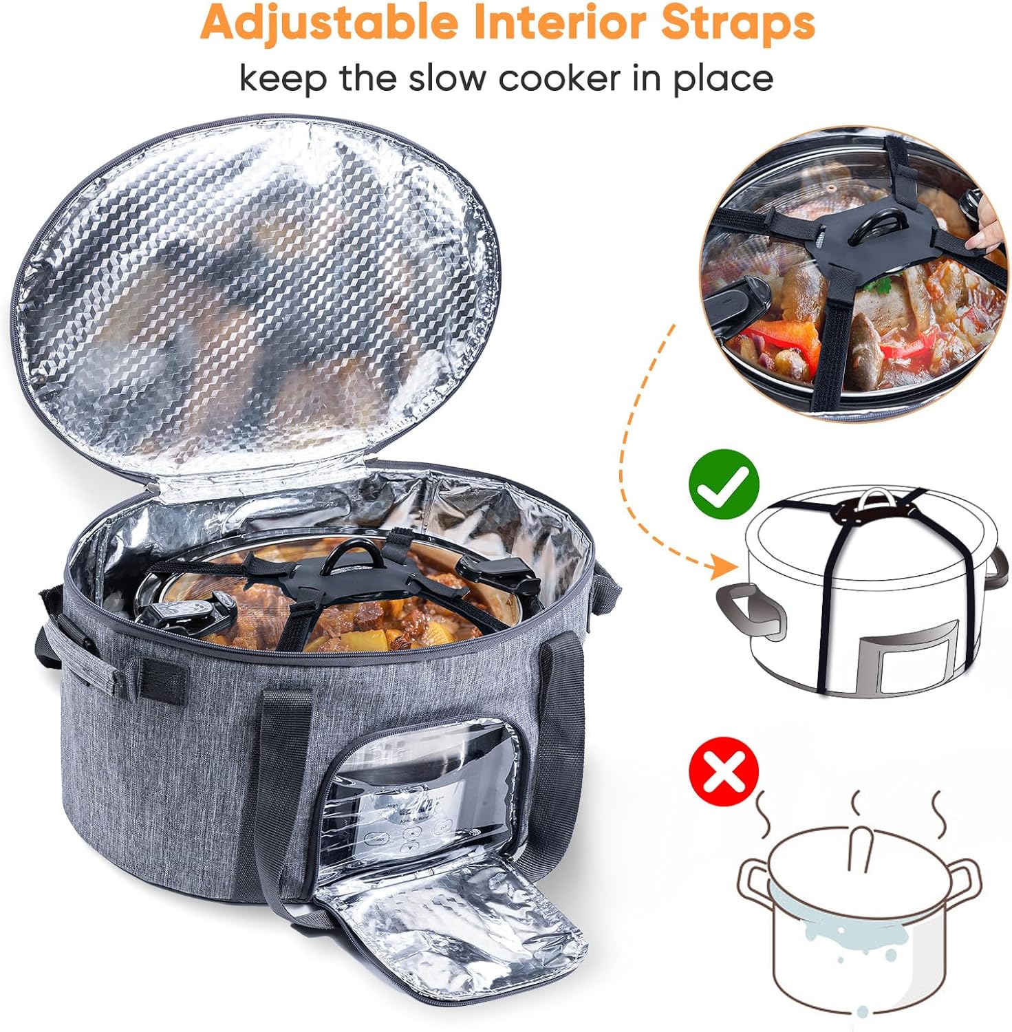 DOUBLE LAYERS Design & Spacious- The main compartment fits the slow cooker well and comes with adjustable bands to keep the crok pot in place to avoid any drips/spills during transportation. The top layer is great for you to store your supplier utensils. Easy to load up a hot crok-pot for a potluck, church, parties, etc.
