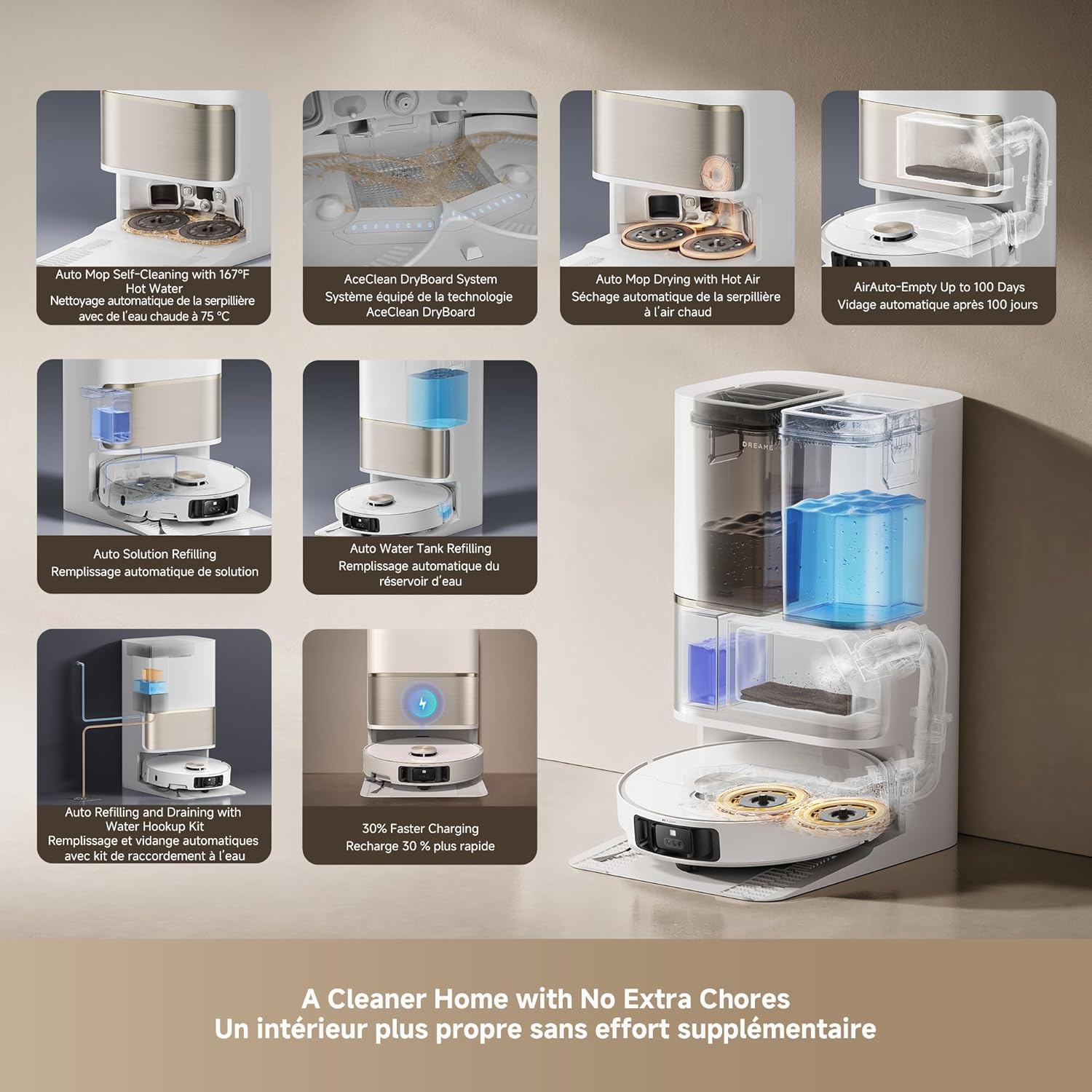 All-in-One PowerDock Convenience: Benefit from the dock’s effortless maintenance. Skip manual dust bin emptying for up to 100 days, rinsing mop pads with hot water from all the dirt, or drying them. L50 Ultra also refills solution and water for mopping and auto-washes its board, creating a hands-free post-cleaning routine.