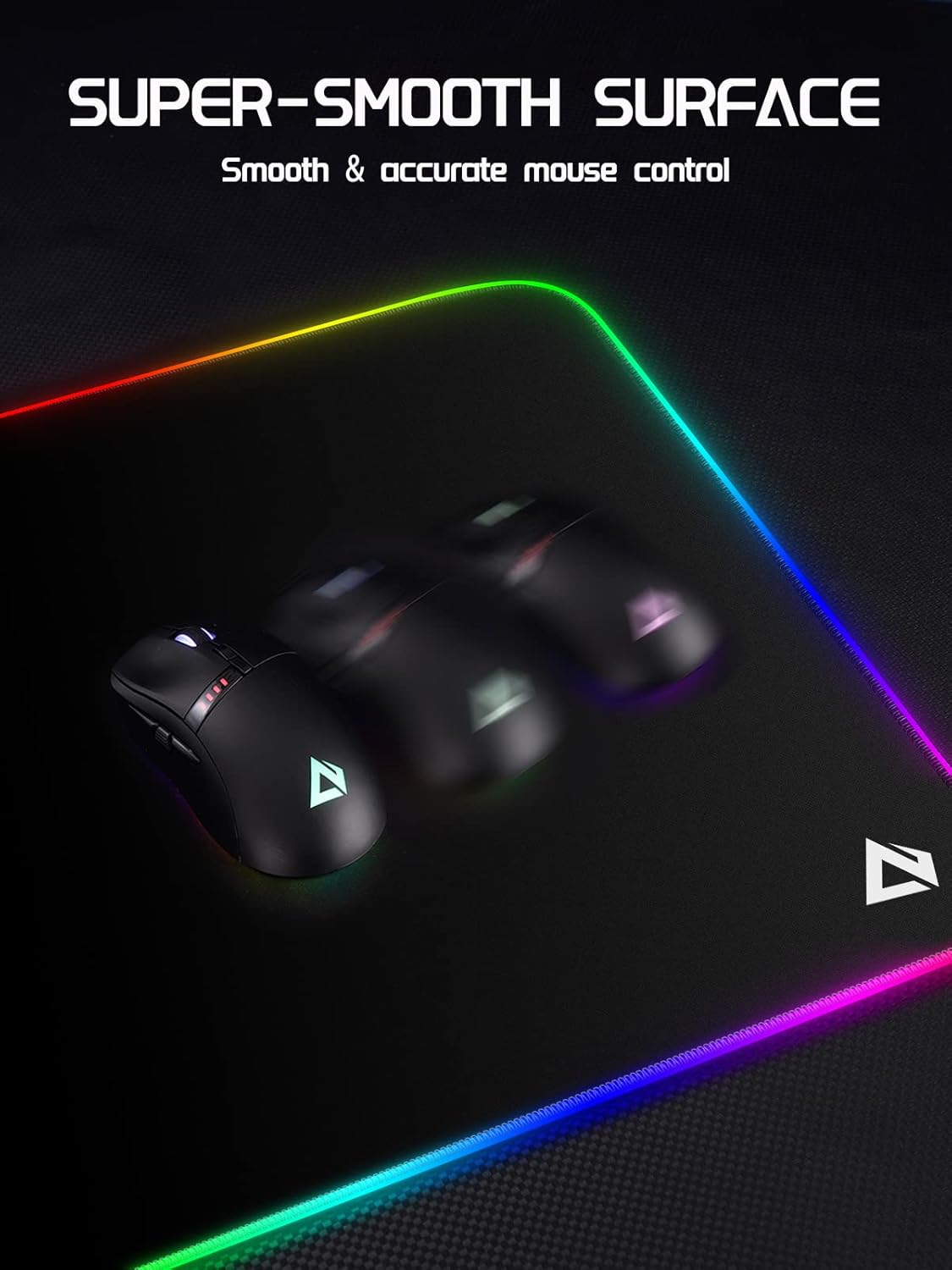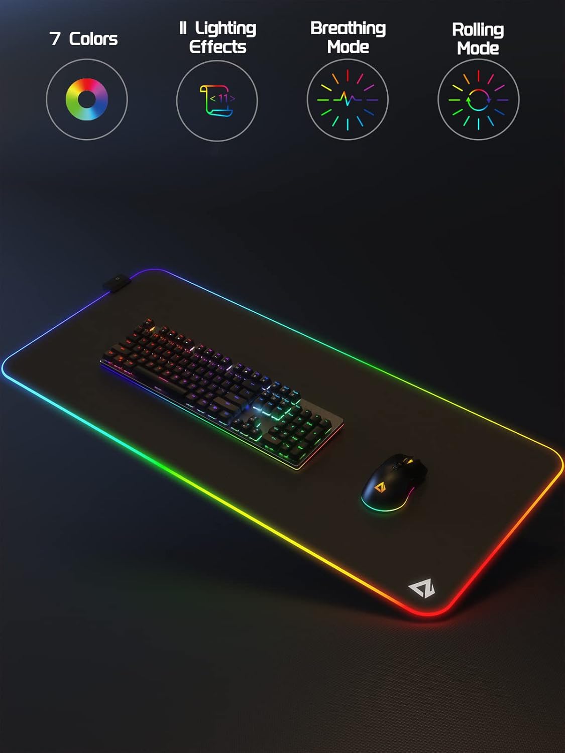 11 LIGHTING EFFECTS RGB MOUSE PAD: One button to easily switch between 11 lighting effects, you can customize your gaming desk setup overnight with 7 static colors and 4 dynamic modes.