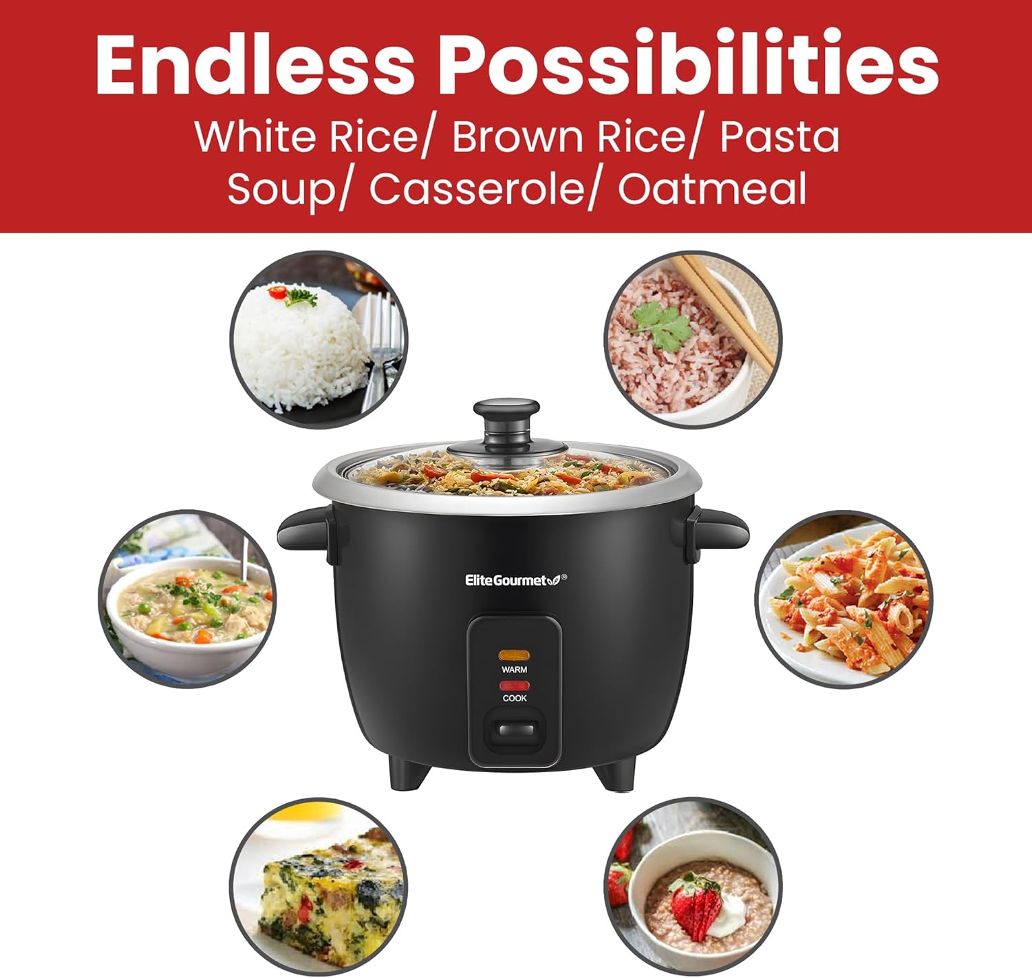 Elite Gourmet ERC003BX Electric Rice Cooker with Automatic Keep Warm Makes Soups, Stews, Grains, Hot Cereals, 6 Cups Cooked (3 Cups Uncooked), Black