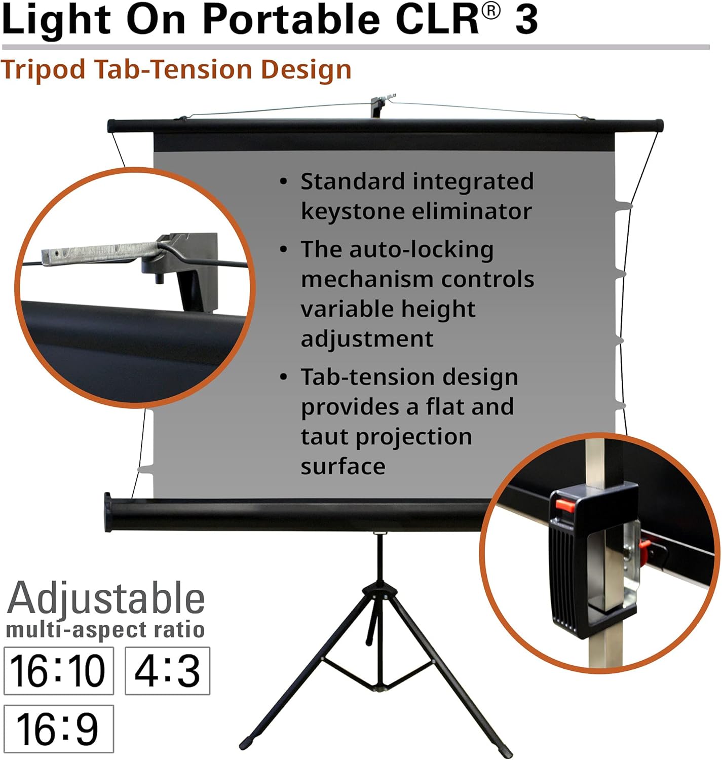 Features a tab-tension system ensures a flat projection surface. Includes a tripod skirt for enhanced aesthetics. Carrying bag included for transporting and storing product.