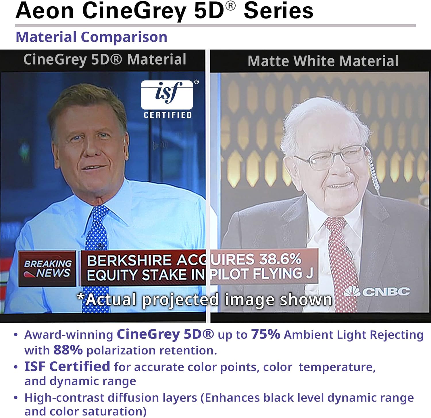 [Screen Material]: CineGrey 5D with 1.5 Gain, 80° viewing angle. CLR/ALR tech rejects ambient light. 4K/8K Ultra HD, Active & Passive 3D Ready. GREENGUARD & GOLD (UL 2818) Certified. For standard throw projectors only.
