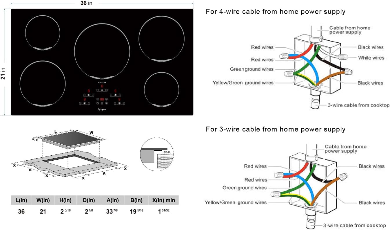 Product dimension 36 in W x 21 in D x 2-5/16 in H, cutout dimensions 33-7/8 in W x 19-5/16 in D