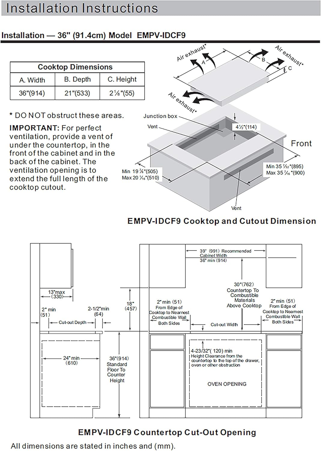 Product Dimensions: 36 in. W x 21 in. D x 2.12 in. H, Cutout Dimensions: 35.22 in W x 19.87 in D. Minimum circuit breaker amperage 50A, 240V hard wiring included, Designed and Engineered in USA with 2 Years US Based Manufacture Warranty.