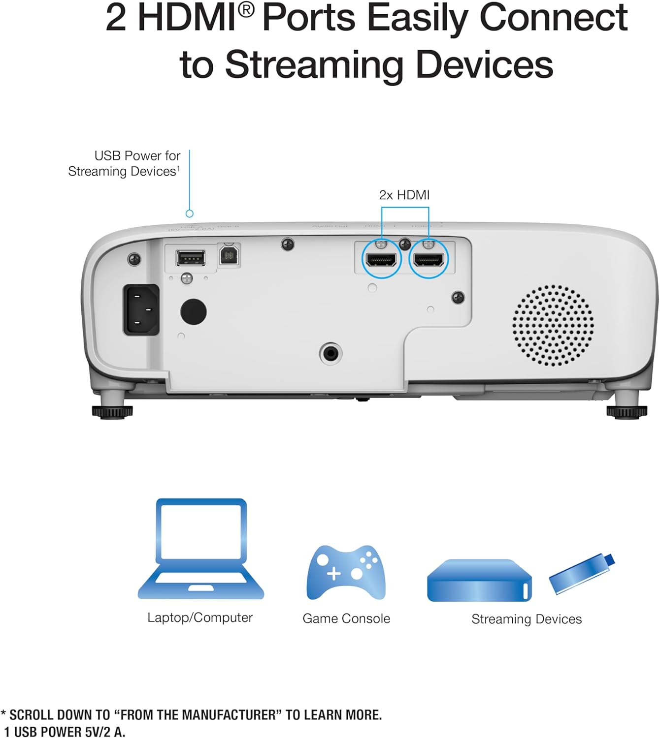 Versatile Connectivity — Offers two HDMI ports and a USB port that functions as a power source for streaming devices²; easily connect laptops and devices including Fire TV, Apple TV, Roku, and Chromecast; connect laptops for seamless video conferencing and more