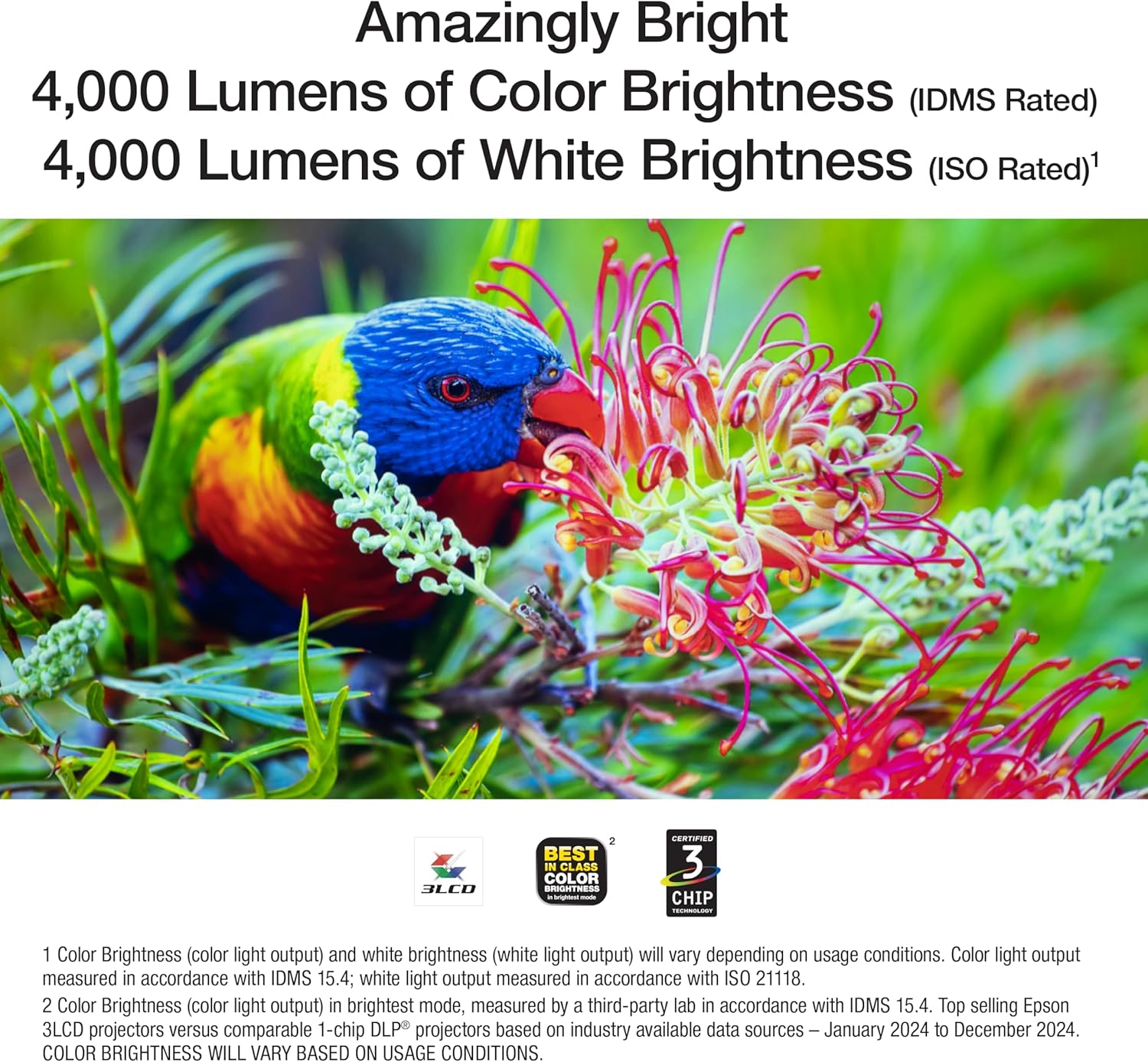 Ultra Bright Images — 4,000 lumens of color brightness (IDMS rated) and 4,000 lumens of white brightness (ISO rated)¹ deliver outstanding-quality images in a variety of lighting conditions