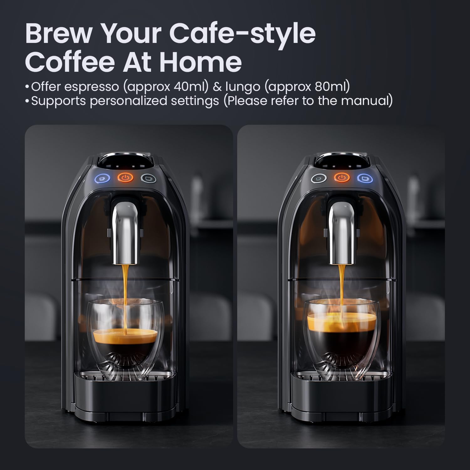 2 Customizable Cup Sizes & One-Touch Brewing: Choose between Espresso (1.35oz) and Lungo (3.75oz), or customize your cup size with a long press. One-touch operation makes brewing effortless.