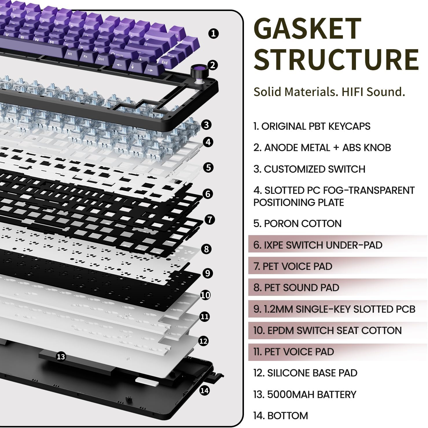 Gasket Structure5000mAh Larger Capacity BatteryUpgraded 6-layer Sound FillingSingle-key Slotted PCB. Large Keys Equipped with Custom Satellite Switches