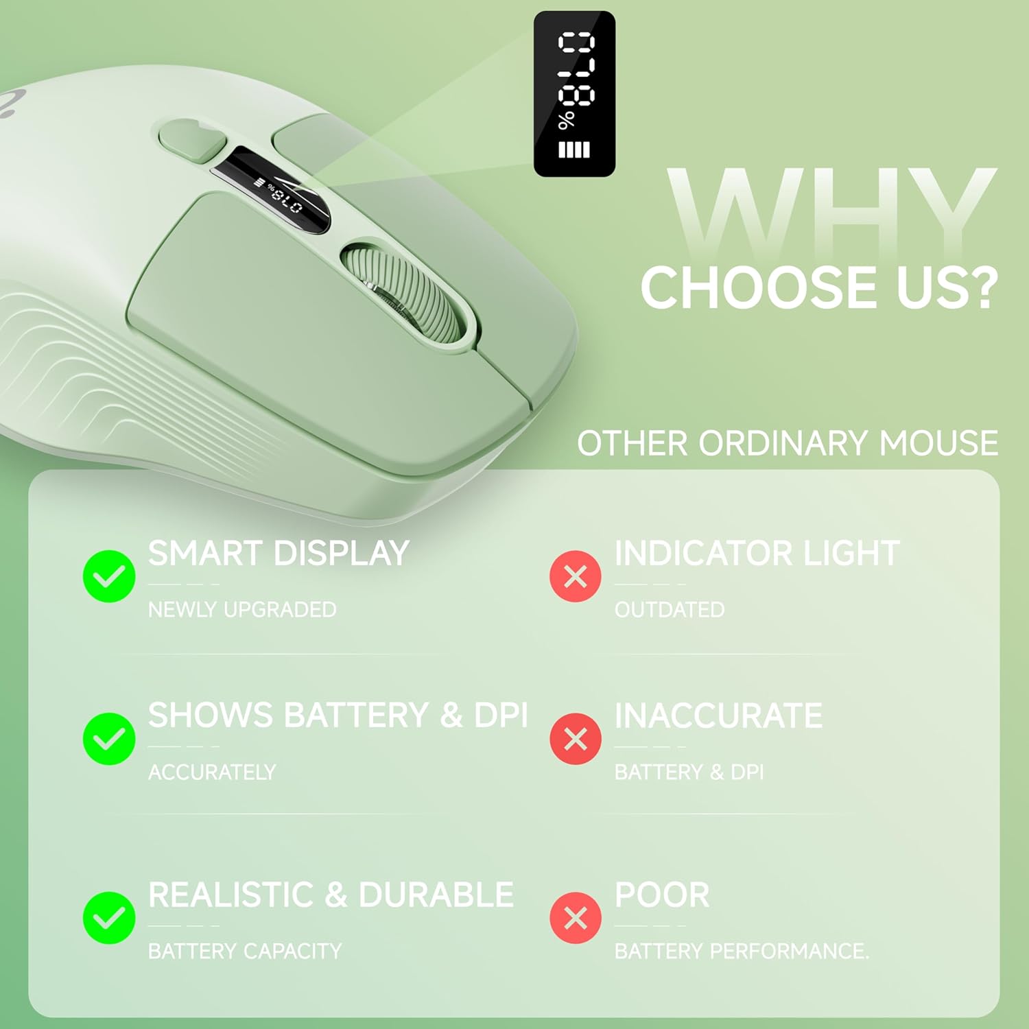 EWEADN Q1 Wireless Mouse, Bluetooth & 2.4G Silent Mouse Quiet Click with 1600 DPI Levels, Battery & DPI LED Screen Display, 6 Button Small Portable Cordless Mouse for Laptop/PC/Mac-Green