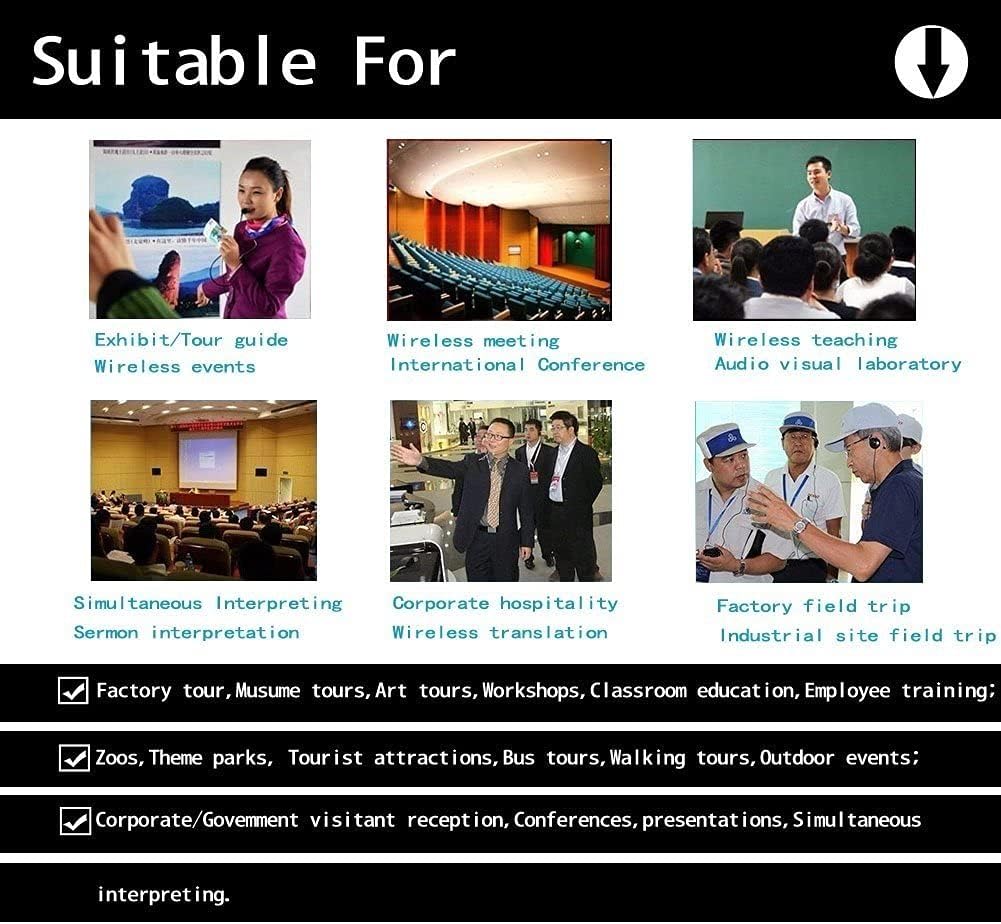 ✤【100-CHANNEL IDs ALLOW TO SCHEDULE AT LEAST 40 TOURS 】470MHZ-490MHZ,100 channels IDs allow at least 40 groups to work simultaneously.Transmitter weighs 66g and receiver weighs 60g,small size Lightweight ,portable. Long transmission range which could be up to 120 meters / 394 ft.Long-Lasting Power; Transmitter has1200 mAh and receiver has 950mAh Built-in lithium battery, make sure it could work for more than 20 hours. Audio tou guide system, Separate your audience from background noise.