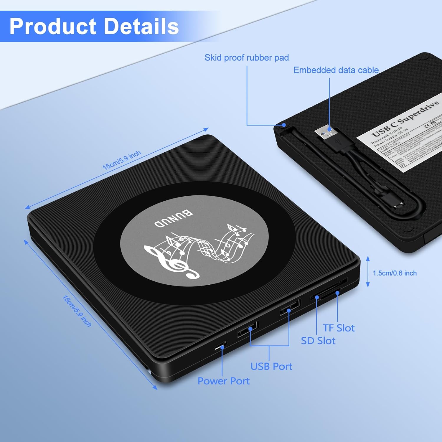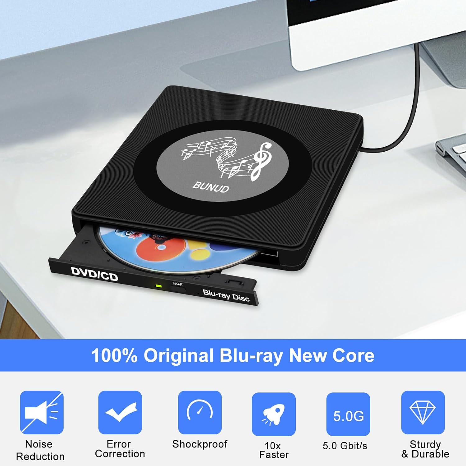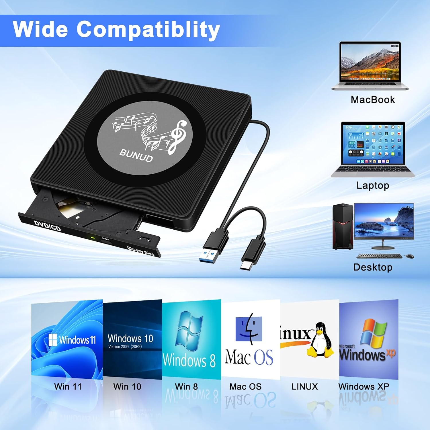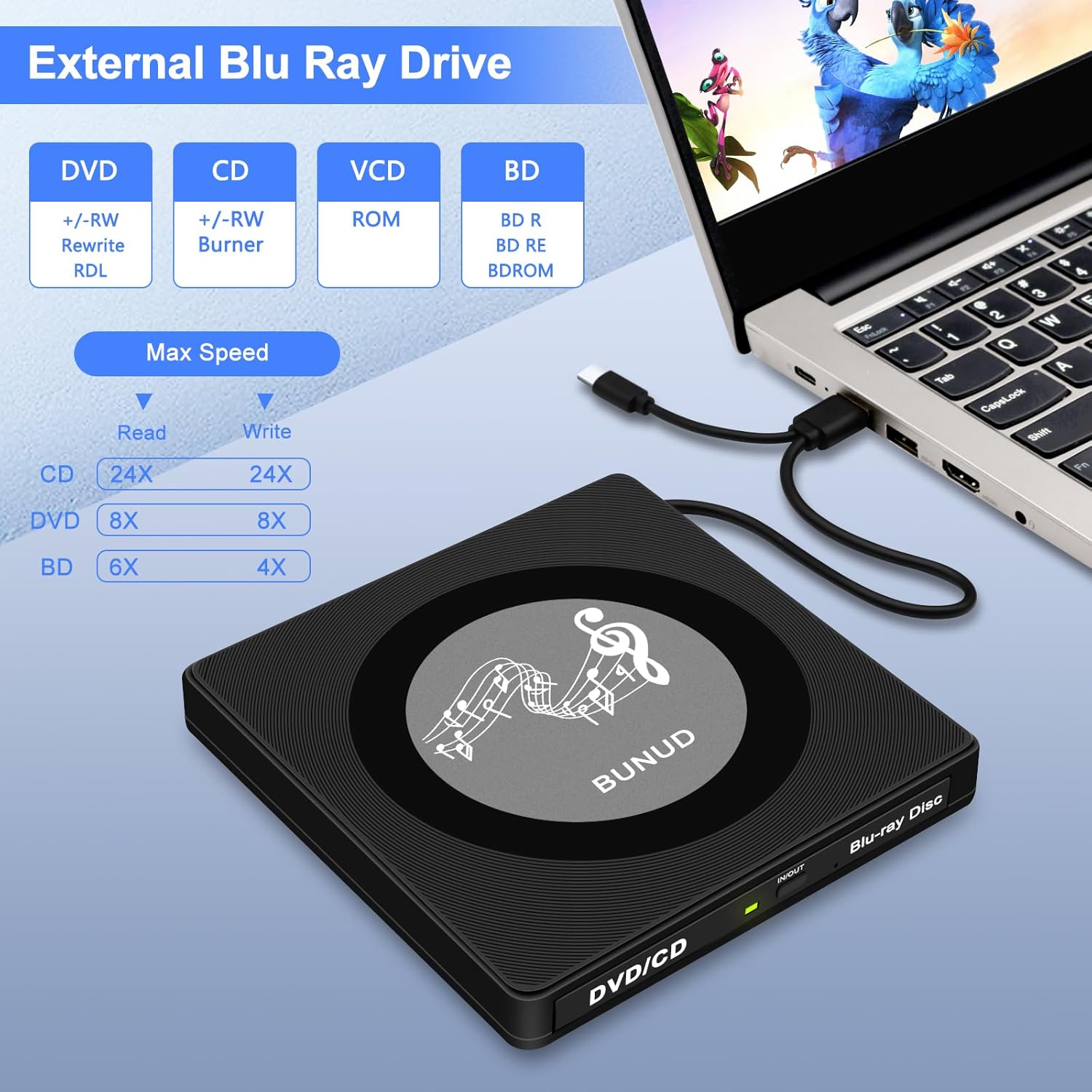 【Multi-Functional Blu-Ray Drive】The portable blu ray CD/DVD Drive for laptop is multi-functional that users can use to play music, watch movies, backup data, install programs, and transfer files. And USB 3.0 & Type C interface has strong error correction capability, impact resistance, low noise, and low power consumption.