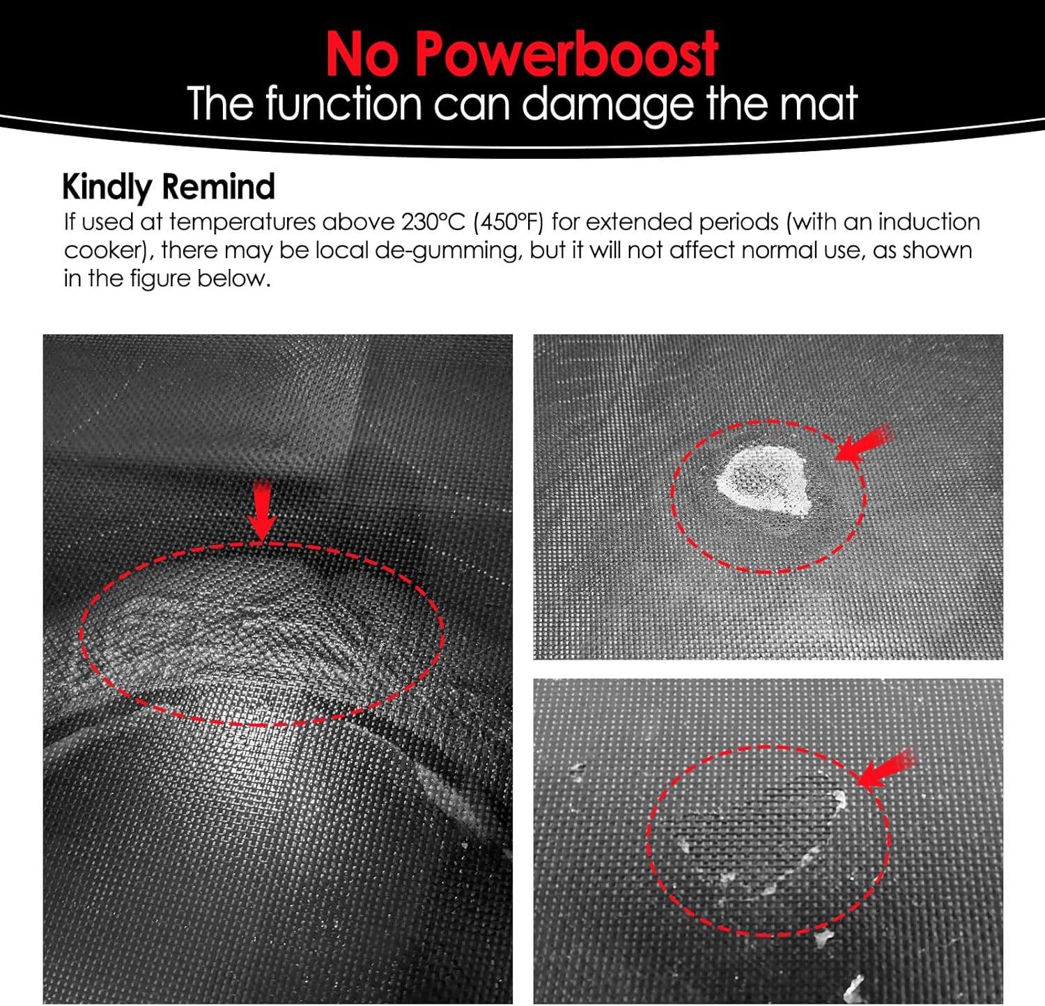 NEW UPGRADE PLATINUM FOOD GRADE SILICONE – Made of specially designed fiberglass coated with food grade liquid platinum silicone (BPA free), reusable, 100% non-stick resistant, and heat resistant to 450℉.If used at temperatures above 230°C (450℉) for extended periods (with an induction cooker), there may be local de-gumming, but it will not affect normal use.