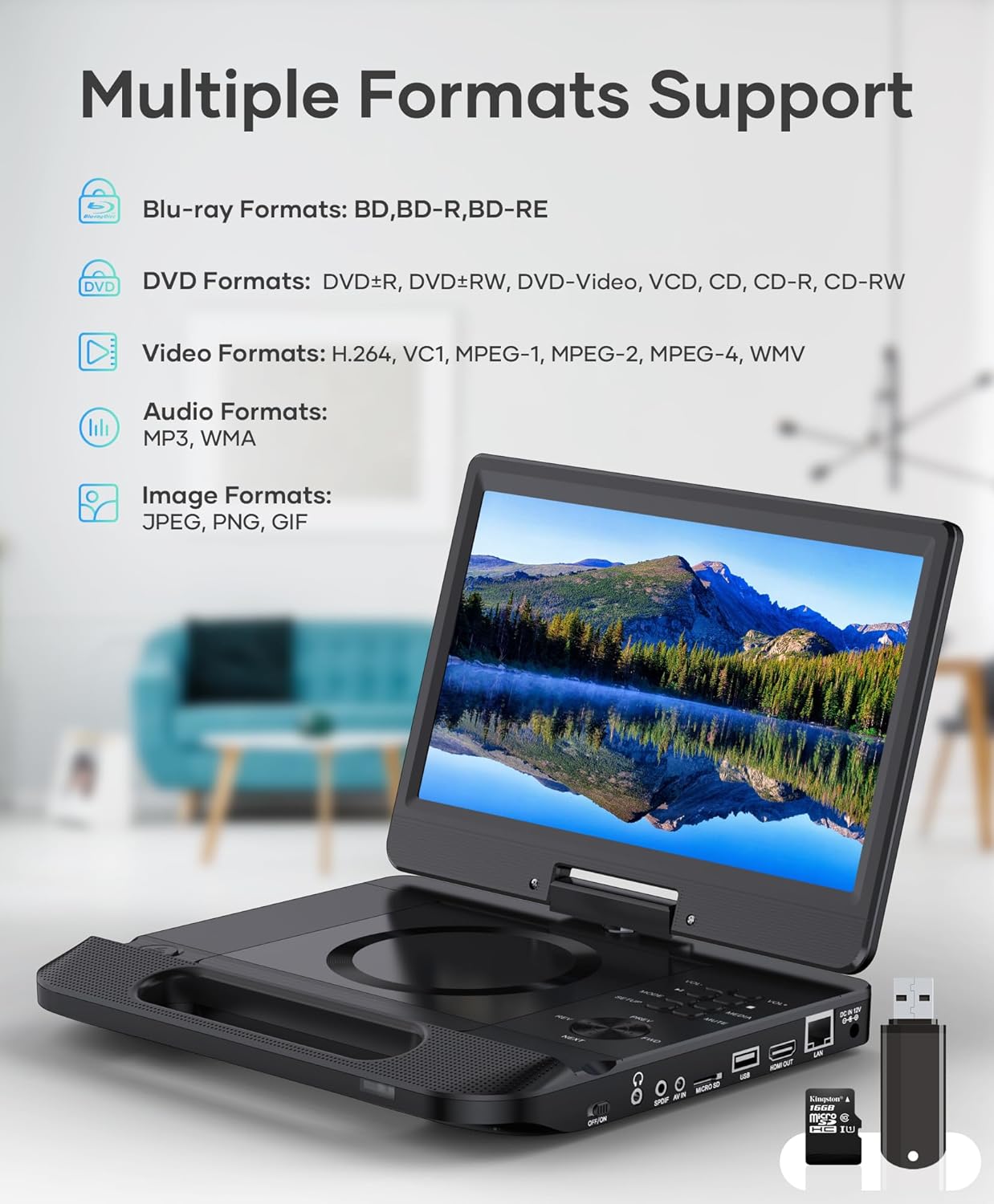 【Multiple Formats Support】The portable blu-ray player for car supports multiple formats playback. DVD formats: BD, BD-R, BD-RE, DVD-R/RW, DVD+R/RW, DVD-Video(Blu-ray DVDs: Region A/1; DVDs: All Regions). Video Fomats: H.264, VC1, MPEG1, MPEG2, MPEG4, WMV. Audio Formats: MP3, WMA. Image Formats: JPEG, PNG, GIF