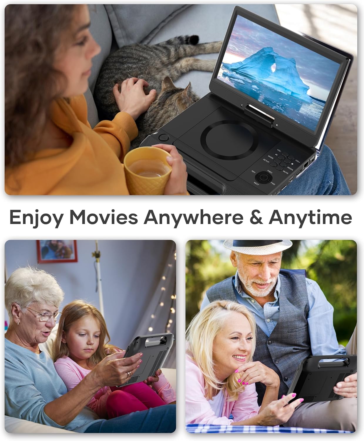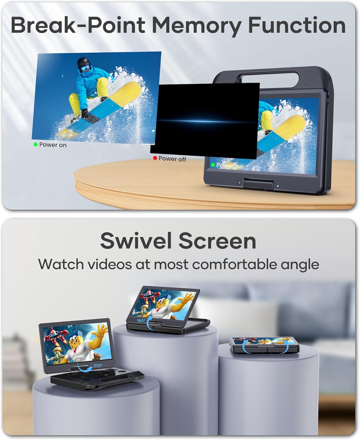 【Last Memory Function & Swivel Screen】The portable blueray player supports last memory function, no need to worry about starting from the beginning, it picks up each exciting scene from where you left last time(To enable the resume function, you must open disc cover before turning off power).With 270° rotatable & 180° flip screen, allow you to enjoy movies at most comfortable angle