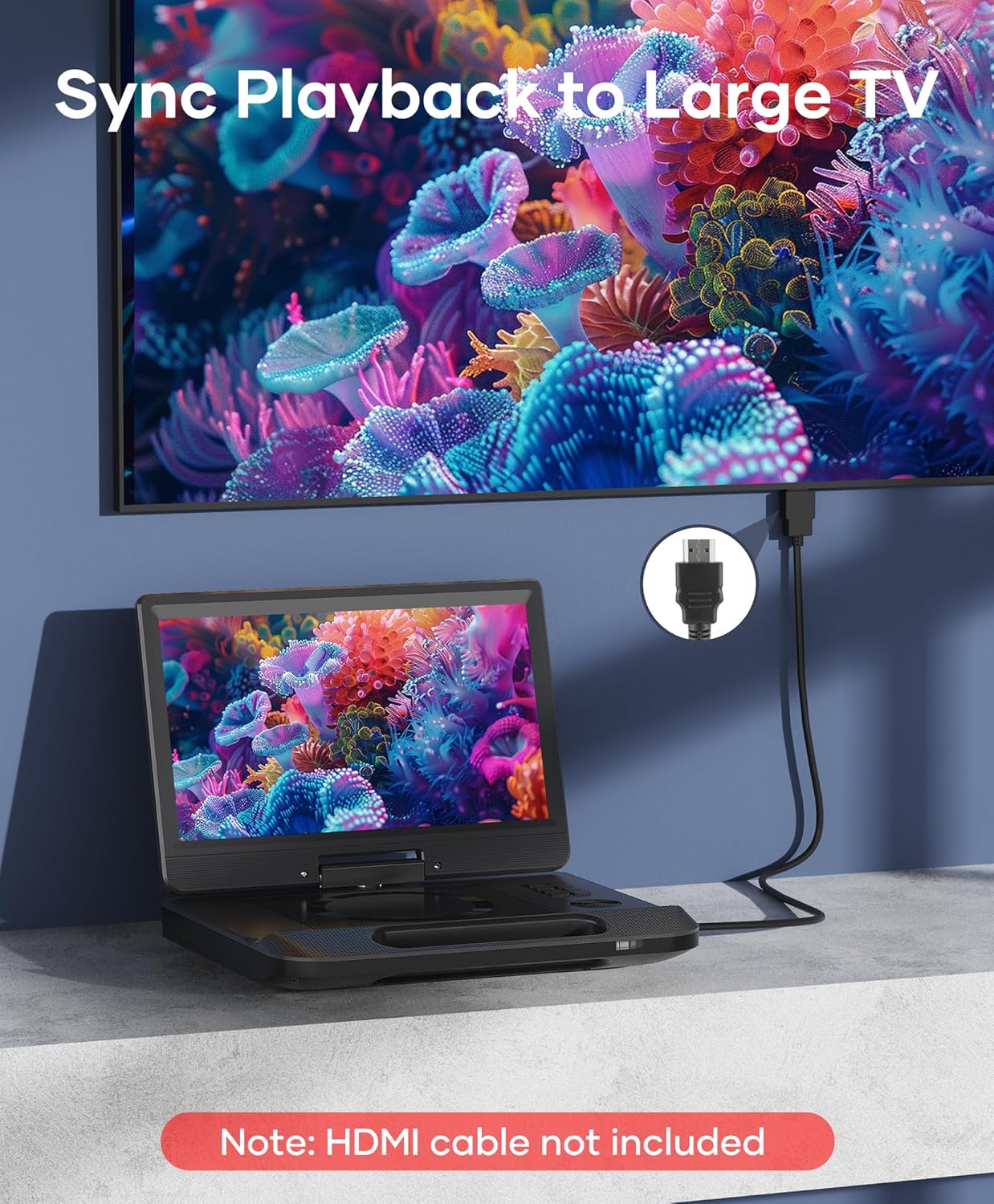 【HDMI OUT Function】The portable bluray dvd player with screen supports HDMI output,allows for high-definition audio and video transmission, ensuring 1080P picture quality and high-fidelity sound without any loss, it can sync playback to TV or projector for large screen visual experience via the HDMI output port, enhancing your home entertainment experience