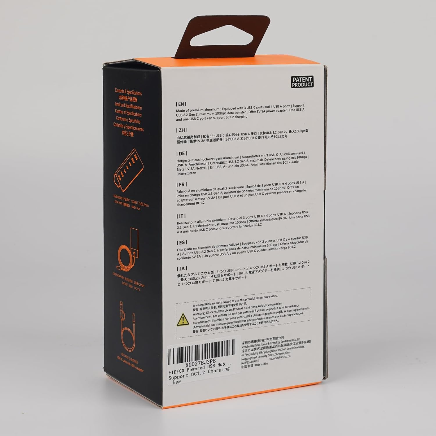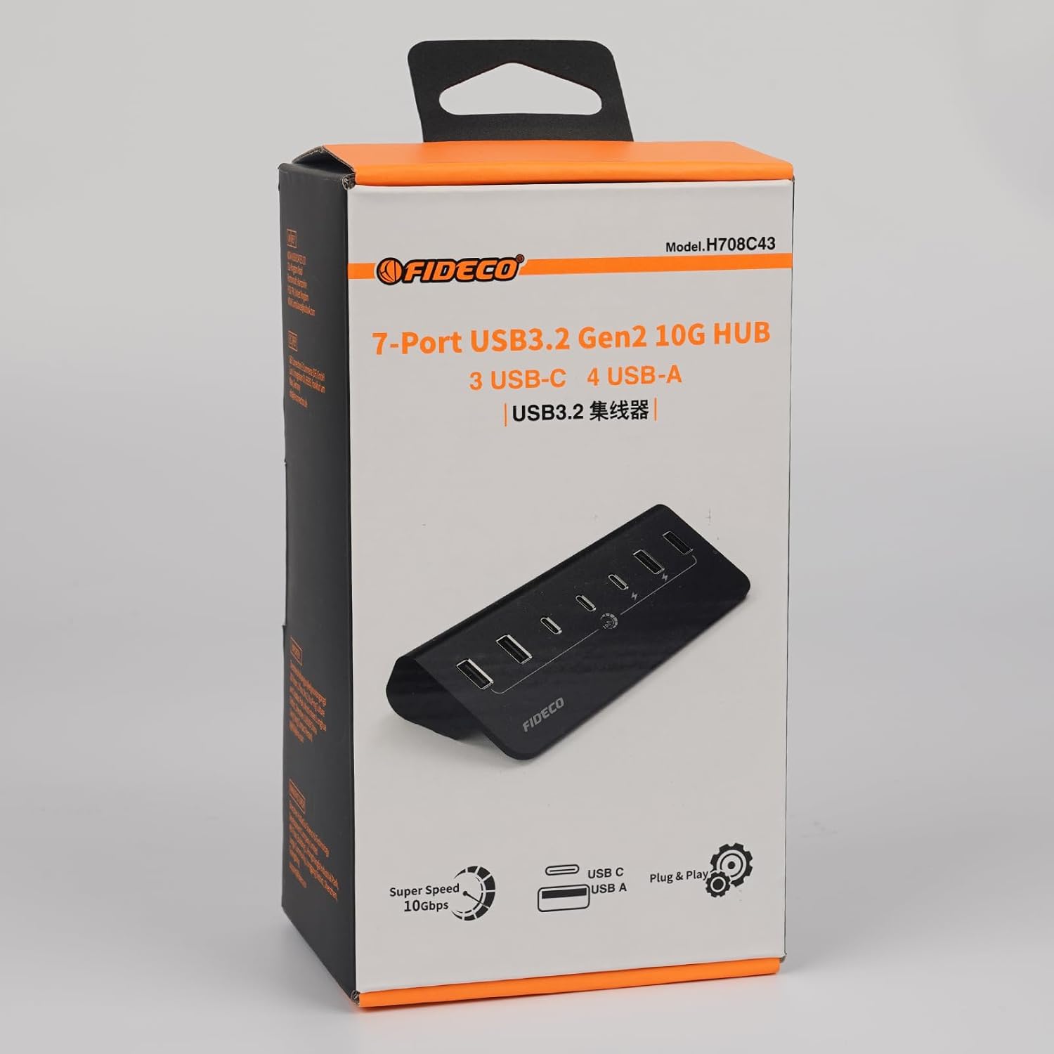 FIDECO Powered USB Hub, 7 Port 10Gbps Fast Data Hub for iPhone 16/15 and Laptop, Full Aluminum USB Splitter with 5V 3A Power Adapter, 4 USB A and 3 USB C Ports, Support BC1.2 Charging