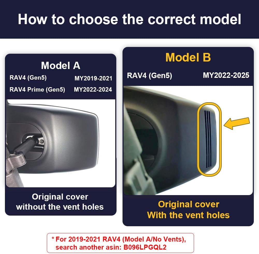For 2022-2025 RAV4, Model B (with Vent): Fitcamx dash cam looks OEM from outside, No cable routing needed, No windshield blocking, it blends very well with the interior. Compatible with Toyota RAV4 2022-2025 & RAV4 Hybrid vehicle styles, which has Vent hole on cover. *NOT fits RAV4 Prime or Plug-In Hybrid , which is another model