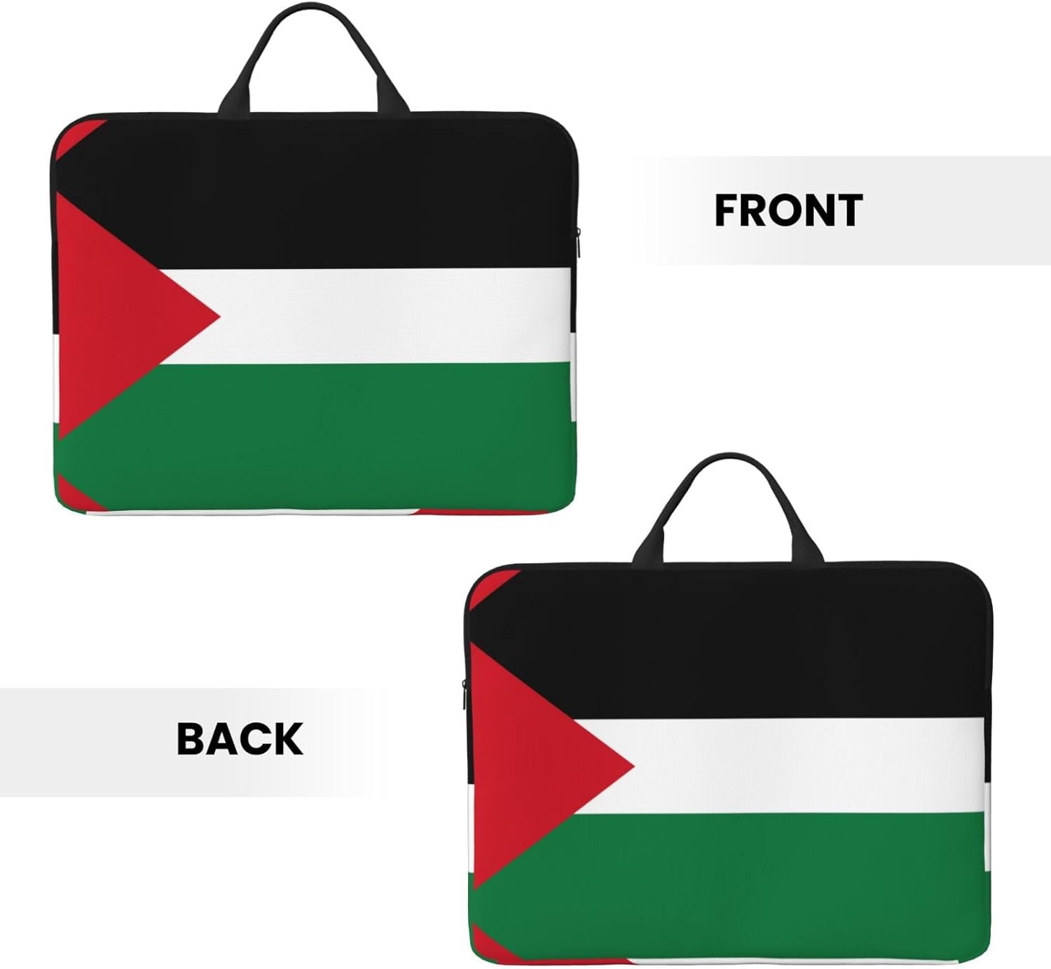 Flag of the State of Palestine Printed laptop sleeve, designed for business people, provides all-round protection. The outer layer is 600D waterproof Oxford cloth, and the inner lining is thickened cotton, which effectively absorbs impact, reduces vibration and friction, and protects the computer. The inner lining is 100% polyester fabric, which is soft and scratch-resistant, comfortable to touch, and protects the screen from scratches. The full-width printed design is stylish and eye-catching, suitable for both business and casual. The classic hand strap is lightweight and durable, and the smooth zipper is quick to access. Designed for laptops 14 inches and below, it is lightweight and easy to carry, ideal for business travel, commuting and travel.