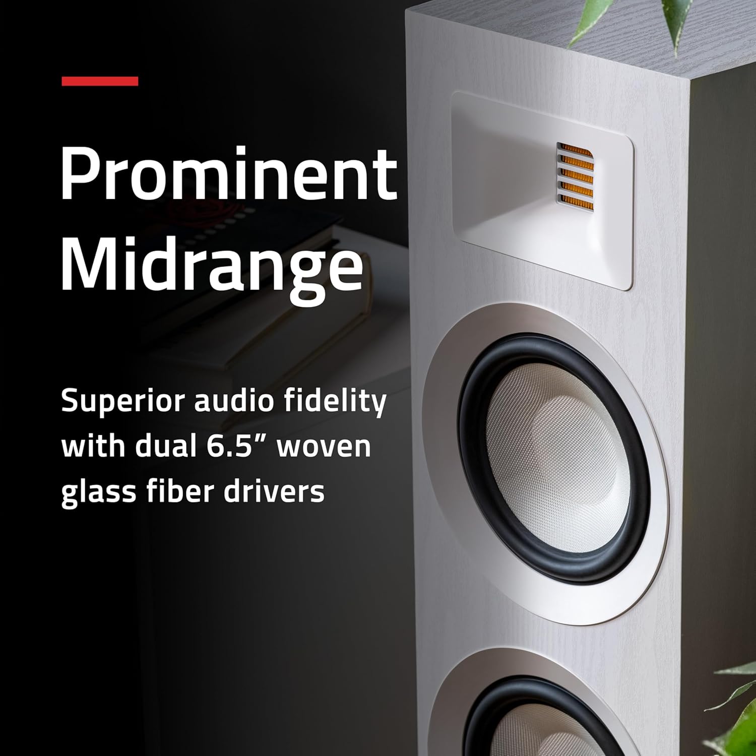 DETAILED MIDRANGE: Unleash superior audio fidelity with dual 6.5″ woven glass fiber drivers. These drivers are crafted to produce a warm midrange and deep bass that turns a room into a concert hall or theater