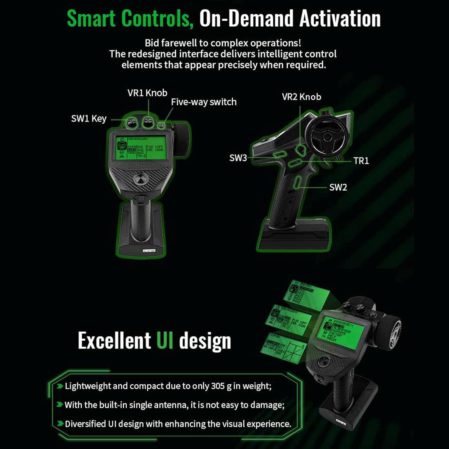 Intuitive Wide-Screen UI & Smart Controls: Effortless programming. Clear wide-screen display shows all vital info instantly. Streamlined menus make binding, BVD calibration, and setup simple. Dedicated SW/VR/TR buttons & 5-way switch offer quick, tactile access