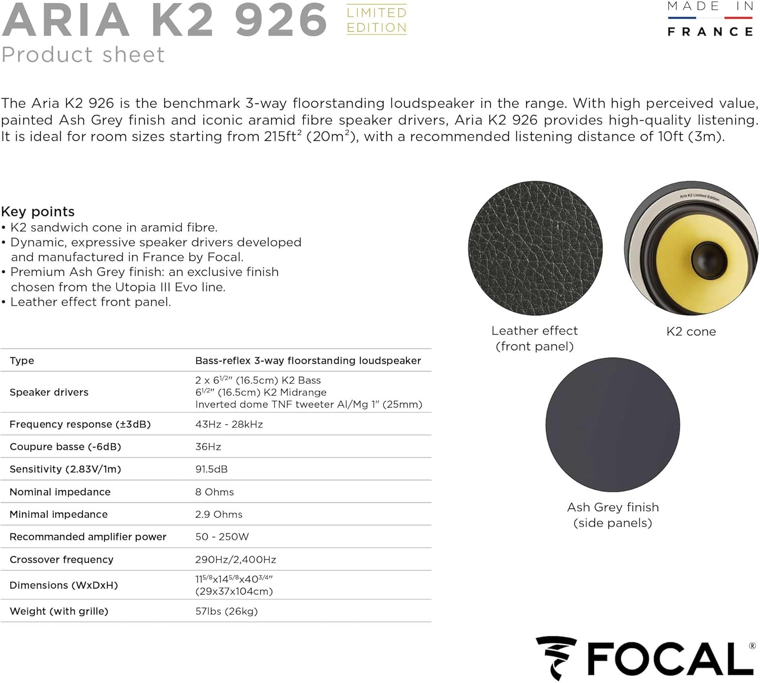 The Aria K2 926 bass-reflex loudspeaker is the 3-way benchmark loudspeaker in the Aria K2 range. Designed, developed and made in France in Focal’s workshops, it is equipped with the iconic K2 Power cone for an exceptional listening experience at home. Exclusive to Focal, this aramid fibre cone provides dynamic sound and high-power handling, as well as giving the loudspeaker lots of character. Alongside its impressive performance, this loudspeaker boasts a modern design and an Ash Grey premium finish from the Utopia line! The front panel has been given an elegant leather-effect cover. Aria K2 926 is perfect for room sizes starting from 215.28ft2 (20m²), with a recommended listening distance of 9.84ft (3m). It enhances the pleasure of new listening experiences, with assertive and inimitable style.