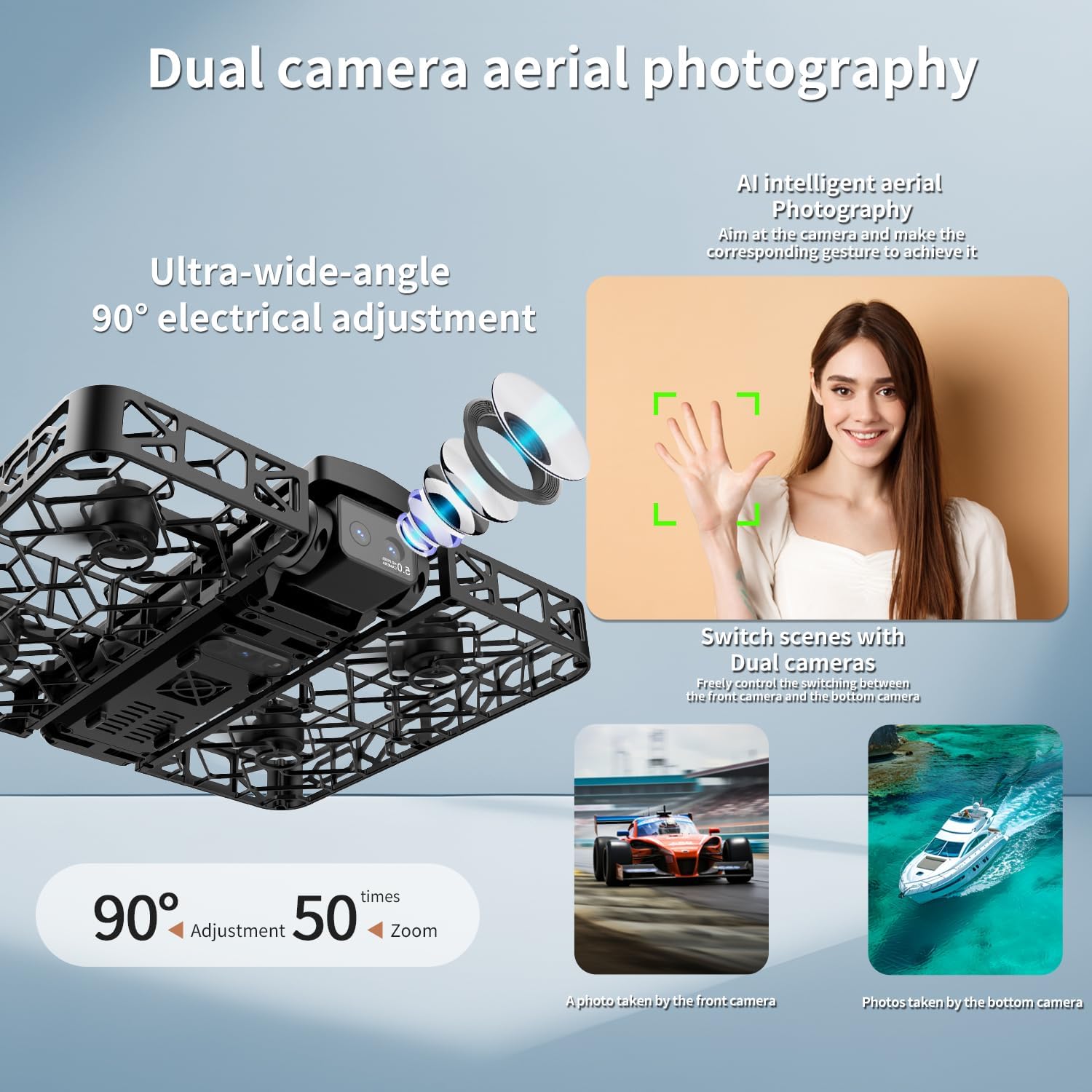 【50x Zoom & Dual 2K Cameras】 Equipped with a front 2K ultra-clear main camera and a bottom optical flow positioning camera. Supports up to 50x digital zoom, capturing fine details from a distance and transmitting high-definition footage in real time to your device.