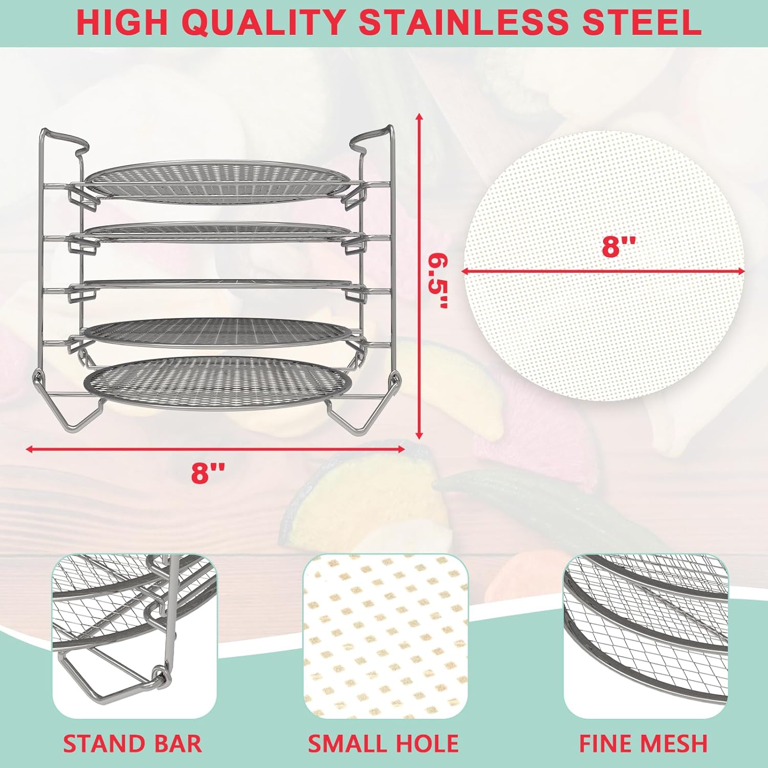 Perfect Combination: The package includes 1 stainless steel dehydrator rack and 5 pcs dehydrating mats, Total Dimension of 5 stackable layers racks:6.5” H x 8” W, the sheets is 8.5 in diameter,made of non-stick silicone,Please confirm the size you need before placing an order!