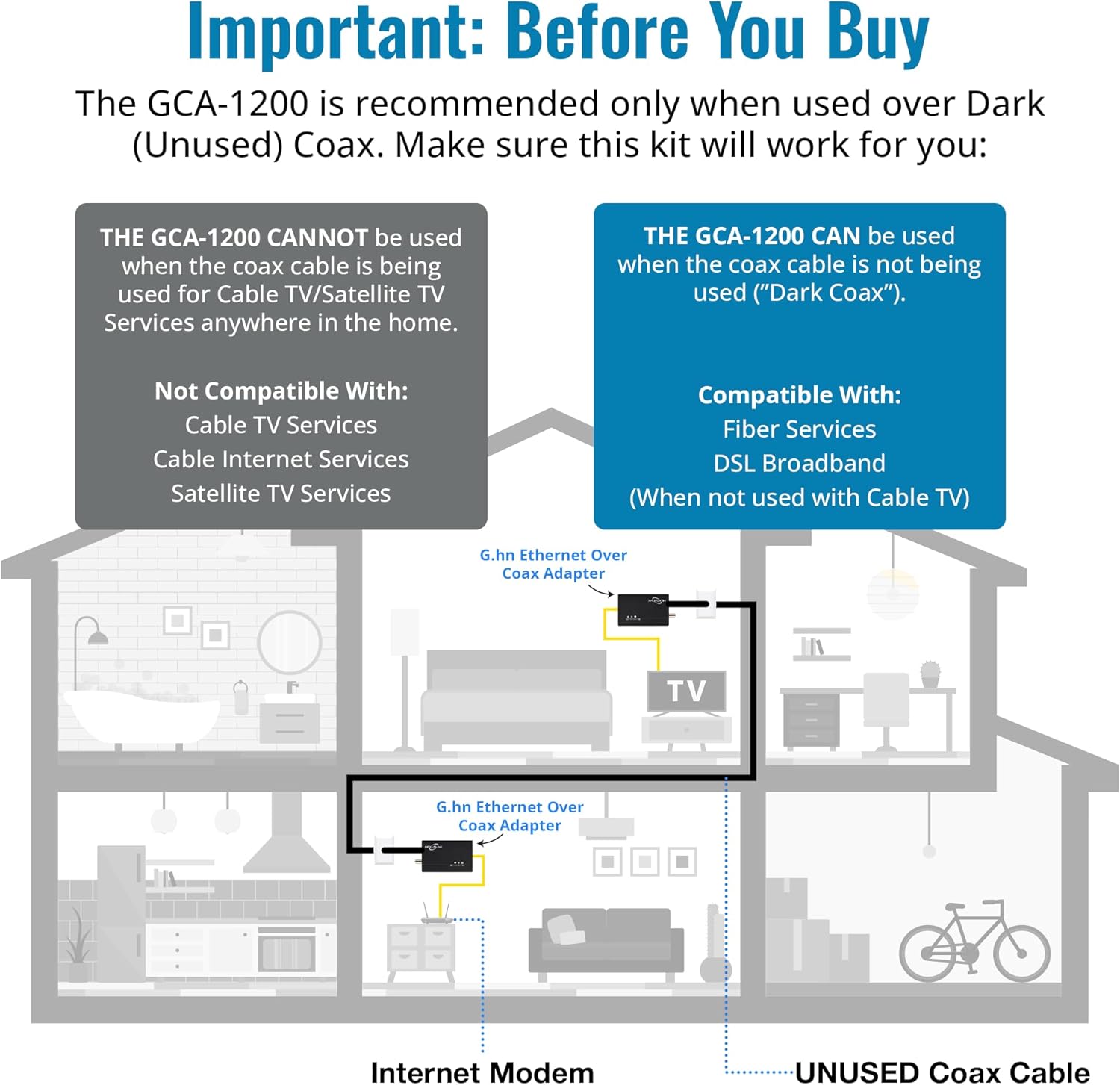 VERSATILE CONNECTION FOR COAX NETWORKS: This adapter works well with unused coax networks, not shared with cable TV or cable Internet services. It supports Ethernet over coax, allowing you to extend your network’s reach and enjoy uninterrupted streaming and gaming. *WARNING*: Use the GCA-1200-KIT on only dark/unused coax networks. It will not work with Cable TV or Cable Internet Services.