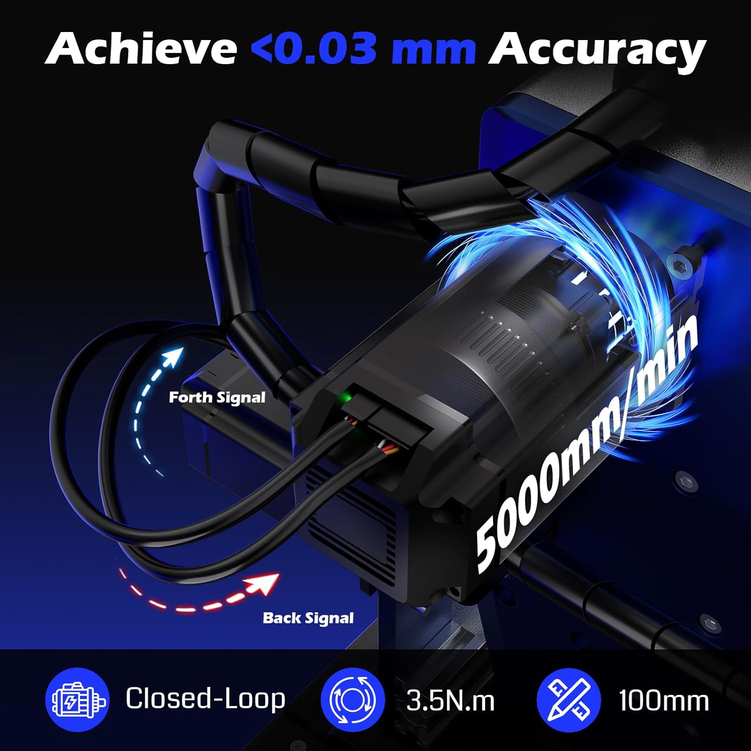 Industrial-Grade Motion Accuracy with Closed-Loop Motors: Experience unmatched precision with 20mm & 1204 ball screws, linear guide rails, and closed-loop stepper motors on all axes. Achieve <±0.03mm accuracy and ±0.01mm repeatability with zero backlash or missed steps—ideal for intricate 3D carving and metal engraving.