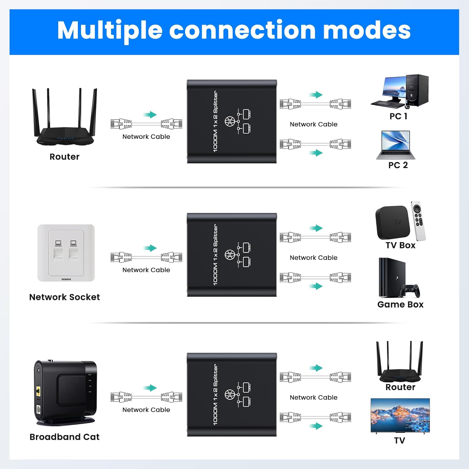 【Aluminium & WIDE COMPATIBILITY】Ethernet Splitter 1 to 2 High Speed is made of high quality aluminum metal to ensure excellent use with Cat8 Cat7 Cat6 Cat5e Cat5 network Ethernet cables, works with hubs, switches, TVs, routers, wireless devices, computers and more, ensuring excellent durability and stability while facilitating heat dissipation.