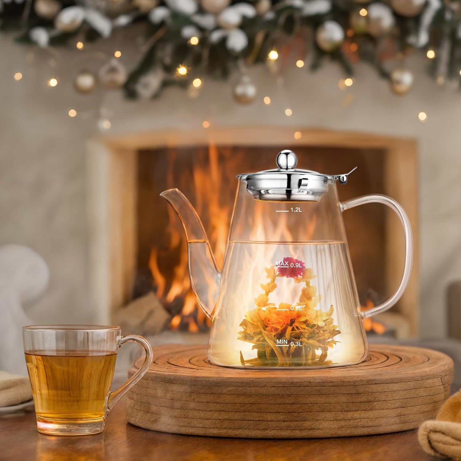 ☕☕【Removable Cover and Filter】: The glass tea kettle with removable 304 stainless steel infuser will become your favorite way to make tea. Its fine mesh filter catches even the smallest tea leaves. The tea infuser comes with a handbasket-style handle that makes it simple to remove the infuser.
