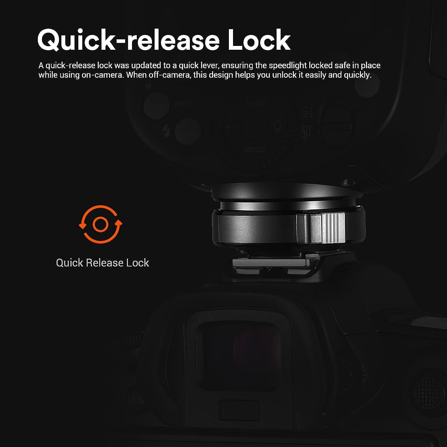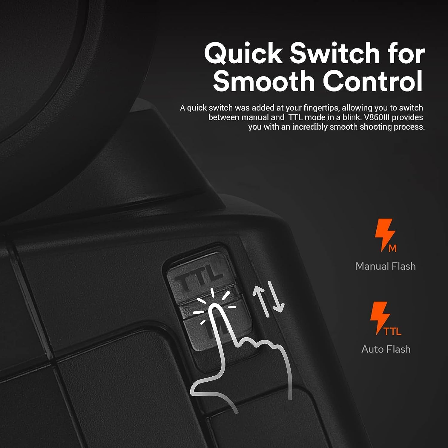 【Quick Switch for Smooth Control】 A quick switch was added at your fingertips, allowing you to switch between manual and TTL mode in a blink. Upgraded Li-ion battery with large capacity escorts your shooting journey by its 1.5s recycling time and 480 full-power flashes.