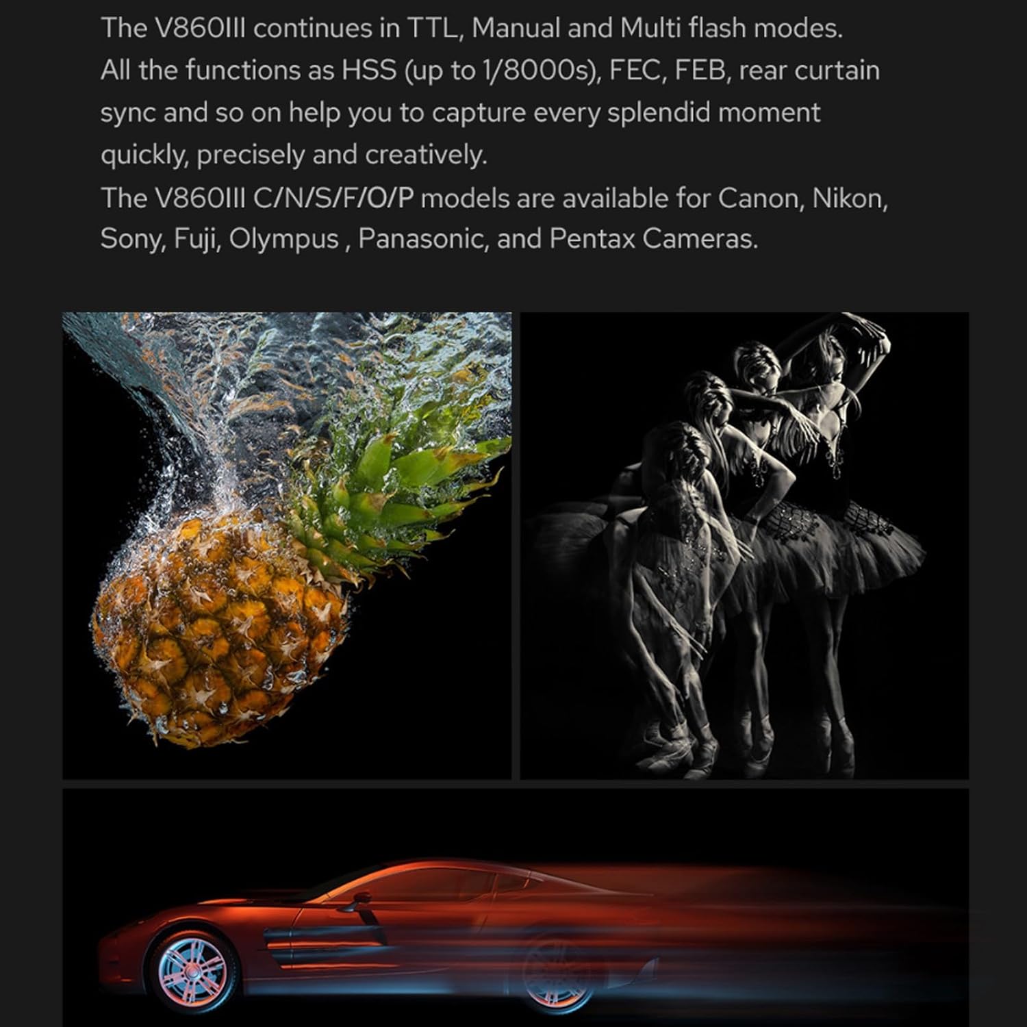 [Fully Support TTL Functions] Godox V860III-N is compatible with Nikon DSLR cameras and I-TTL II autoflash. Supporting for TTL auto flash, manual flash, 1/8000 high-speed sync, flash exposure compensation, flash exposure lock, second curtain sync, modeling flash, etc.