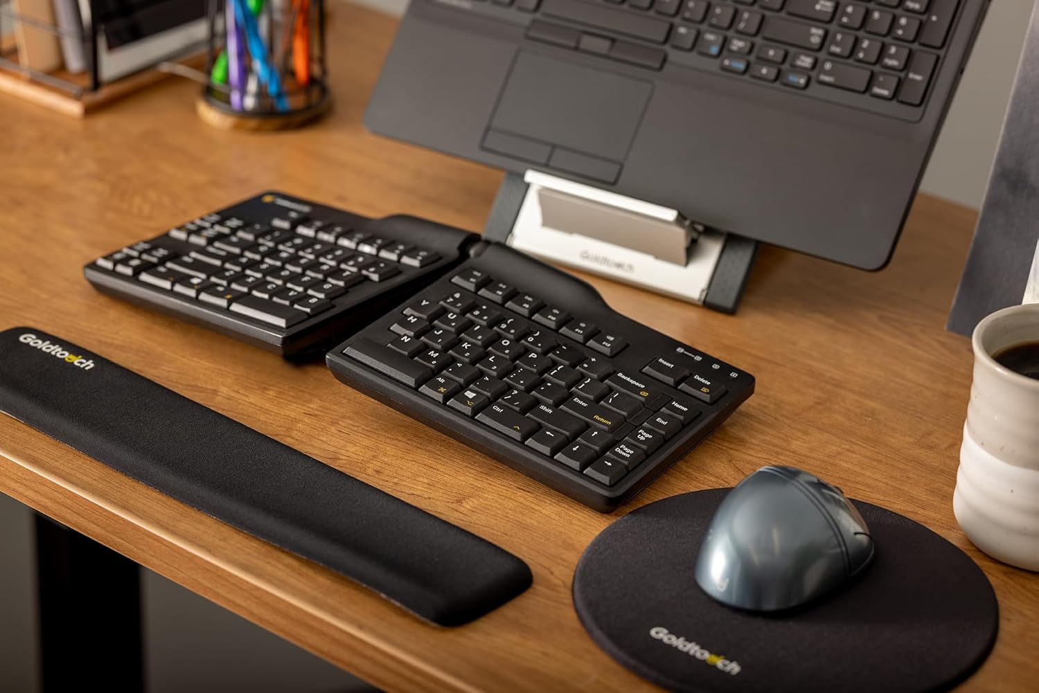 With the handle squeezed, tent the keyboard upwards until you determine the angle where any tension in the hands, wrists, and forearms disappears. Release the handle.