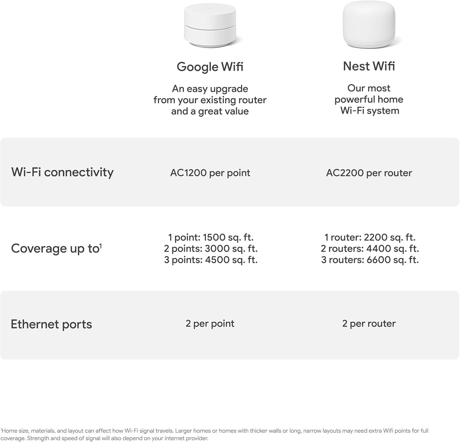 Google Wifi is an easy-to-set-up whole-home mesh Wi-Fi system. Google Wifi points work together to create a mesh network that blankets your whole home in fast, reliable Wi-Fi and eliminates buffering in every room, on every device – with coverage up to 4500 square feet. [1] It’s Wi-Fi that just works. [2] Home size, materials, and layout can affect how Wi-Fi signal travels. Larger homes or homes with thicker walls or long, narrow layouts may need extra Wifi points for full coverage. Strength and speed of signal will depend on your internet provider. [3] Minimum OS requirements [4] Controlling certain devices and features in your home requires a compatible smart device.