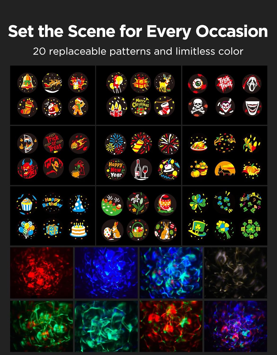 Extensive Library of Patterns: Govee snowflake projector includes 20 replaceable discs and 58 scene modes to cover year-round events and holidays, allowing you to effortlessly set the mood and create the perfect ambiance with a single tap.