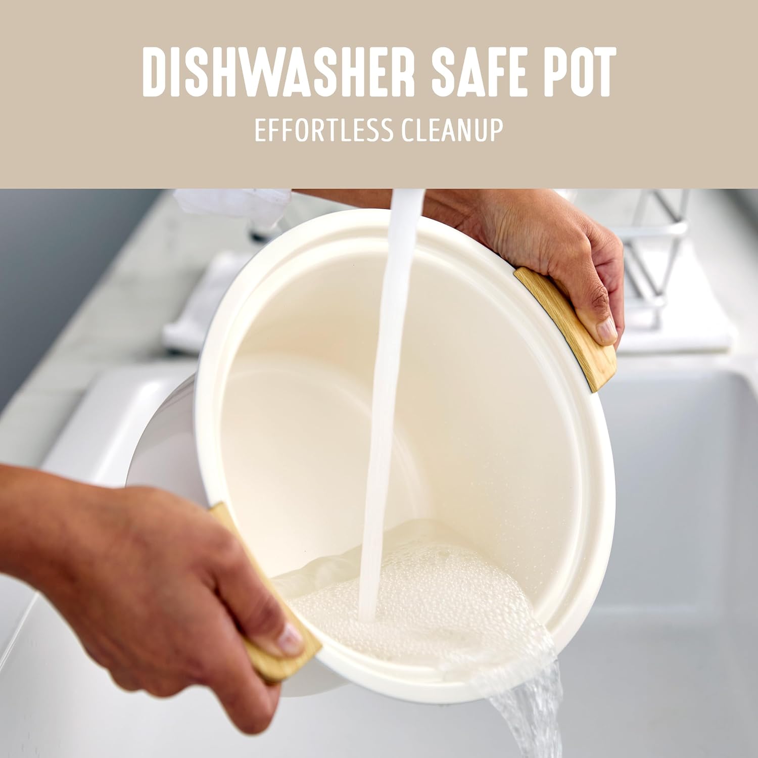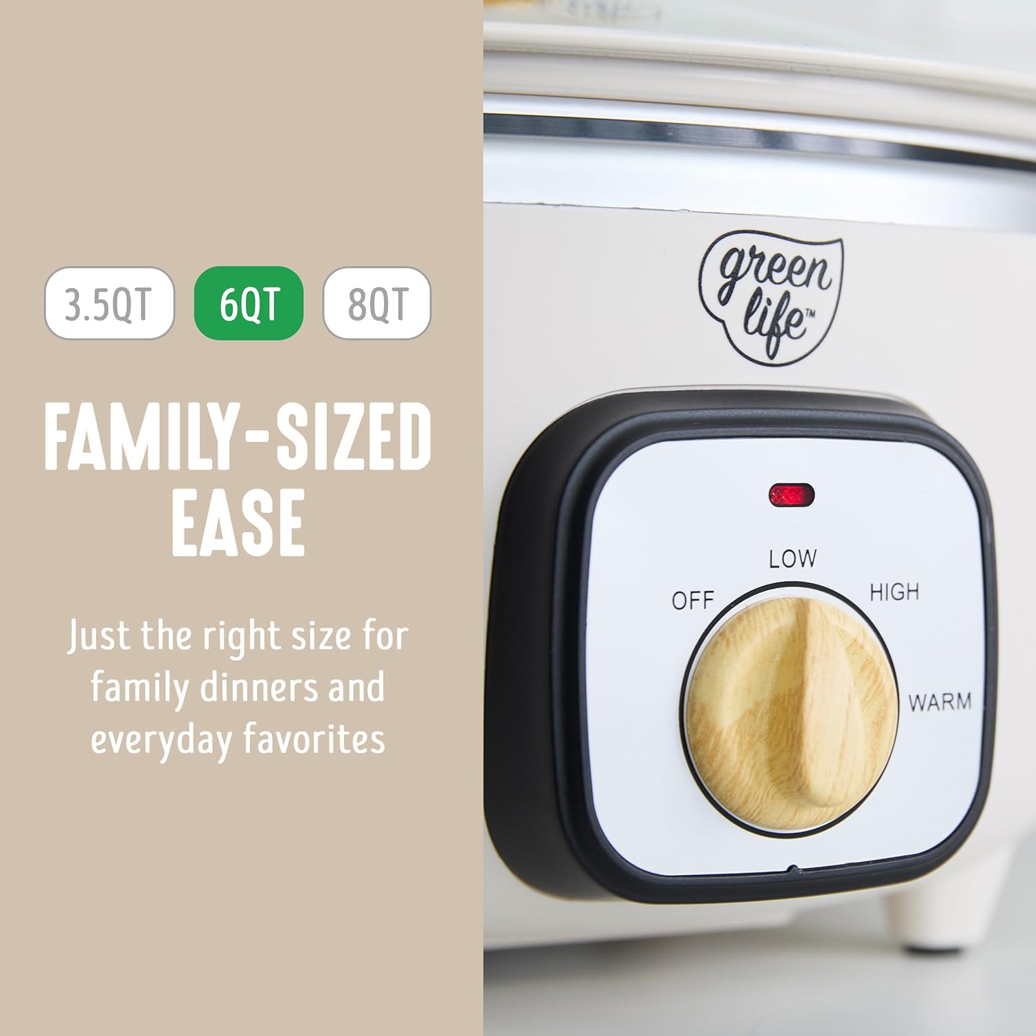 The GreenLife Healthy Slow Cooker makes it easy to whip up delicious meals that are worry-free. Its 3.5-quart removable pot is the perfect size for soups, stews, chili, and more – while the compact design saves space on your counter and in your cabinets. The removable pot is stovetop and oven safe up to 400˚F, so you can start with a quick sear to build flavor, then slow cook to tender perfection. GreenLife’s signature healthy ceramic nonstick makes cleanup easy and it’s PFAS-free for healthier meals, morning to night. The simple control dial features Low, High, and Warm settings to match your meal and your schedule, while the clear glass lid lets you monitor your food without losing heat. When your creation is done, turn the dial to Warm to maintain that fresh flavor and serve on your time. Plus, the removable pot and lid are both dishwasher safe for an easy cleanup.