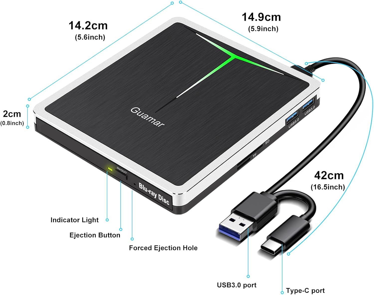 【New Design Blu-Ray Drive】Guamar 5 in 1 external blu ray drive is completely new designed. This blu ray drive with 1 SD Card Reader,1 TF Card Reader and 2 USB3.0 Port Hubs.There is a Color-Changed Light on the top of the Surface.This external bluray drive can read BD/CD/DVD discs,aslo be used lika a TF&SD Card Reader , Hard Drive, USB flash drive