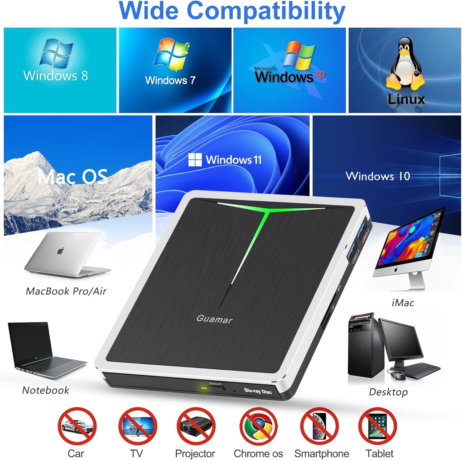 Guamar external Blu ray drive with 2 USB ports and SD/TF slot, compatible with Windows 11/10/8/7, Linux and all vision Mac OS system.