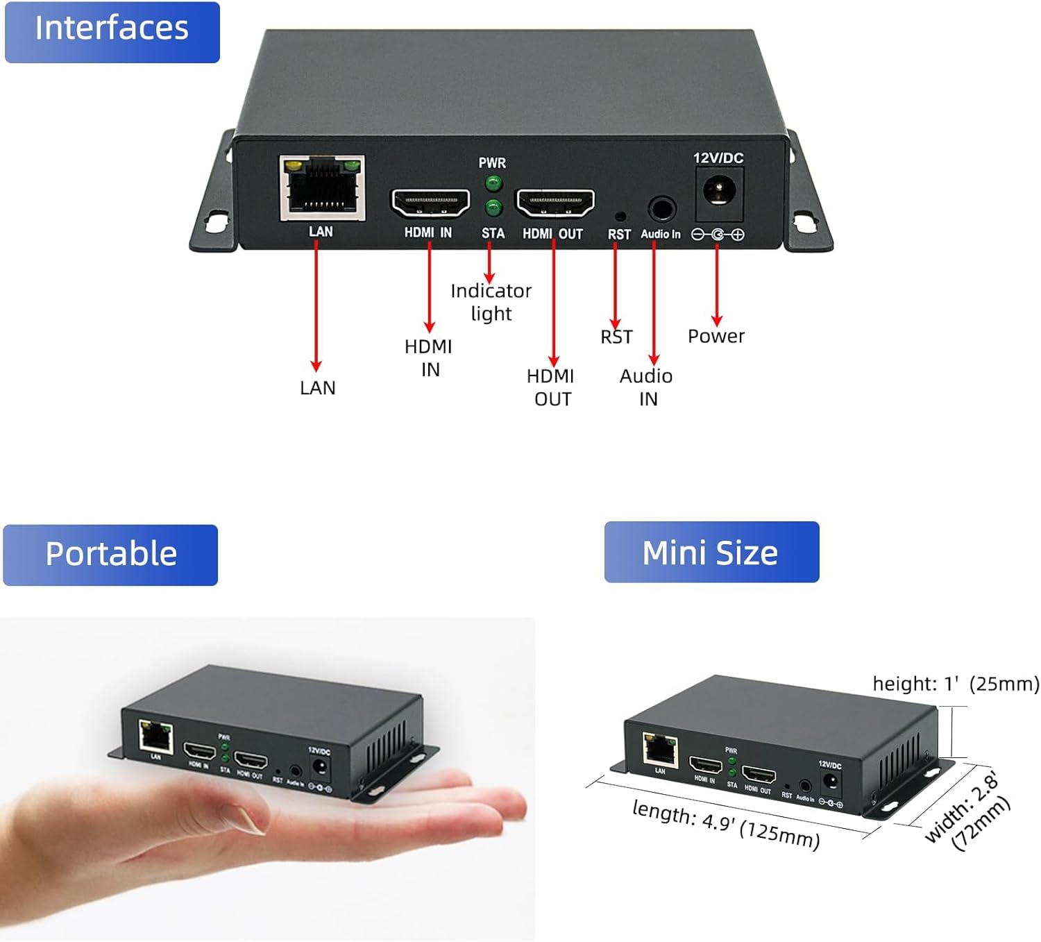 【Upgrade Notice】Please kindly note that this mini video encoder EH1201 has been upgraded to EH1211 from the stock batch after Jul.29th, 2025. The new EH1211 add extra USB and TF card port on the back of the device for you to record RTSP broadcasting video or record from HDMI video source to the external USB disk or TF card. Also, it supports customize cropping and encoding of input signal source video images. For more details, please find details in below webpage. Please note that EH1211 is upgraded both on chips and apperance, so the previous EH1201 can’t been upgraded to new EH1211 by firmware.